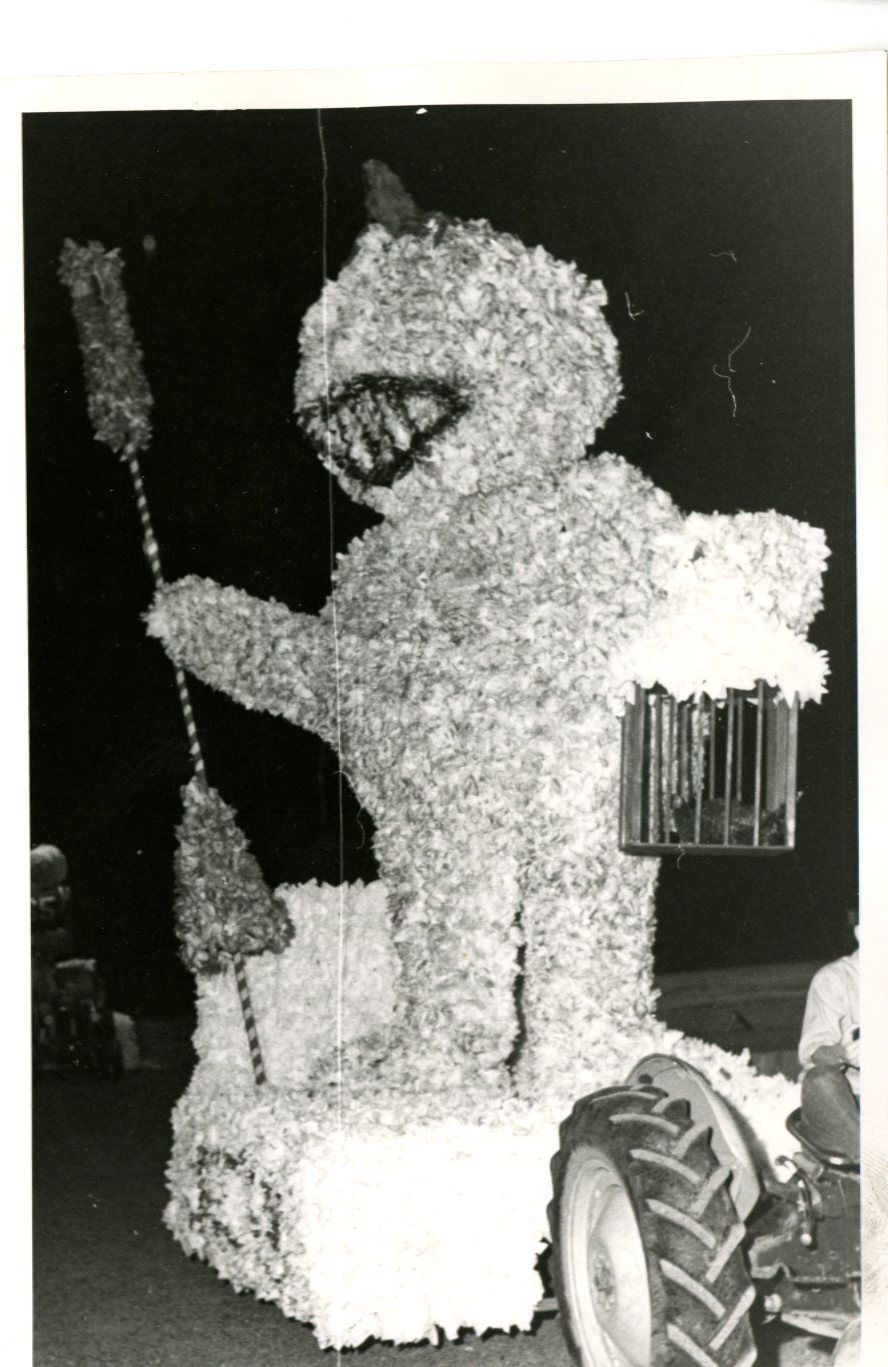 Black and white photo of parade float. Tractor pulling possibly a one eye, one horn flying purple people eater. Costume has one eye, horn on head and is holding staff and bird cage.