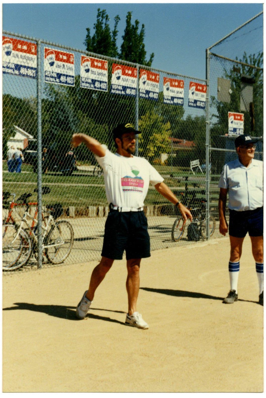 Item is a colored photograph taken during the 1990 Broomfield Days celebration. The photo centers around Mayor Bob Schulze, who is wearing a black baseball cap, black shorts, and a white t-shirt that reads "Broomfield Days 1990" with the image of a hot air balloon floating above the mountains. He is standing in a baseball diamond in front of the wire caging, which is riddled with RE/MAX advertisements. He is winding up to toss a baseball, and the man next to him is watching the outfield. There are bikes parked outside the caging, and houses and large trees line the street in the background. Schulze was elected in 1989 and served until his term ended in 1994.Photograph Details