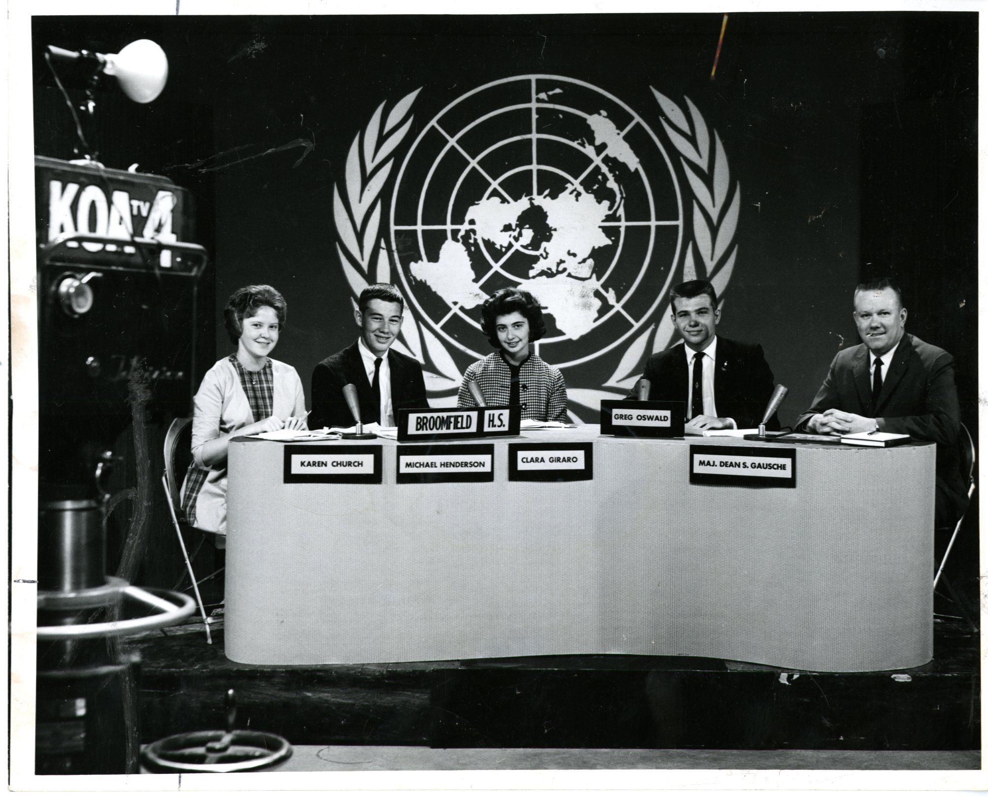 Black and white photo of five people at news desk. Sign says KOA TV 4, UN logo is back drop, Broomfield HS sign on desk. Name cards for Karen Church, Michael Henderson, Clara Giraro, Greg Oswald an Maj. Dean S. Gausche.Collection