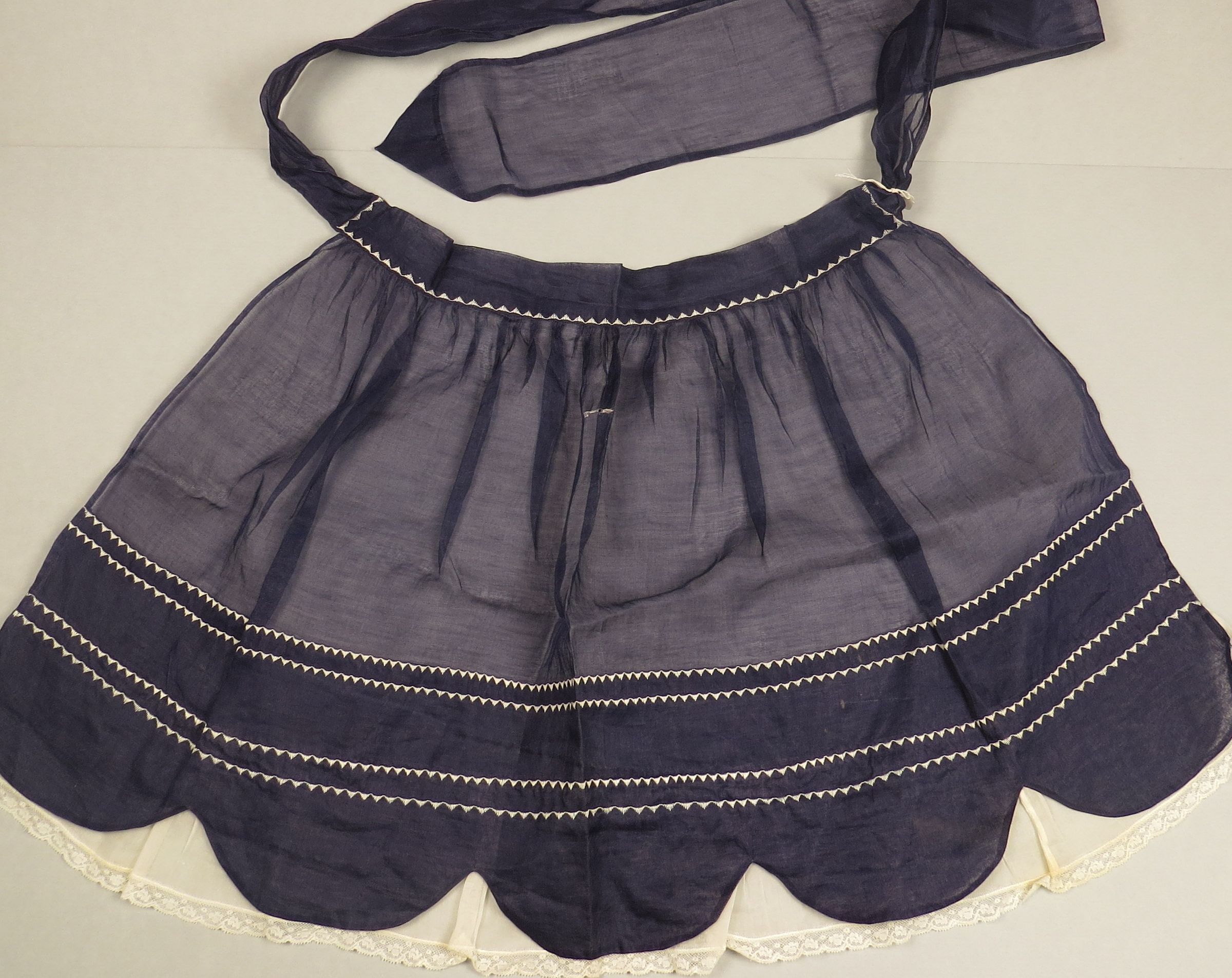 Navy blue organdy half apron with a white organdy bottom ruffle that peaks out from the scalloped bottom edge of the navy material. There is a white decorative stitch used in two groupings of two lines at the bottom and also around the waistband. Apron measures 10" (w) x 32" (l).Collection