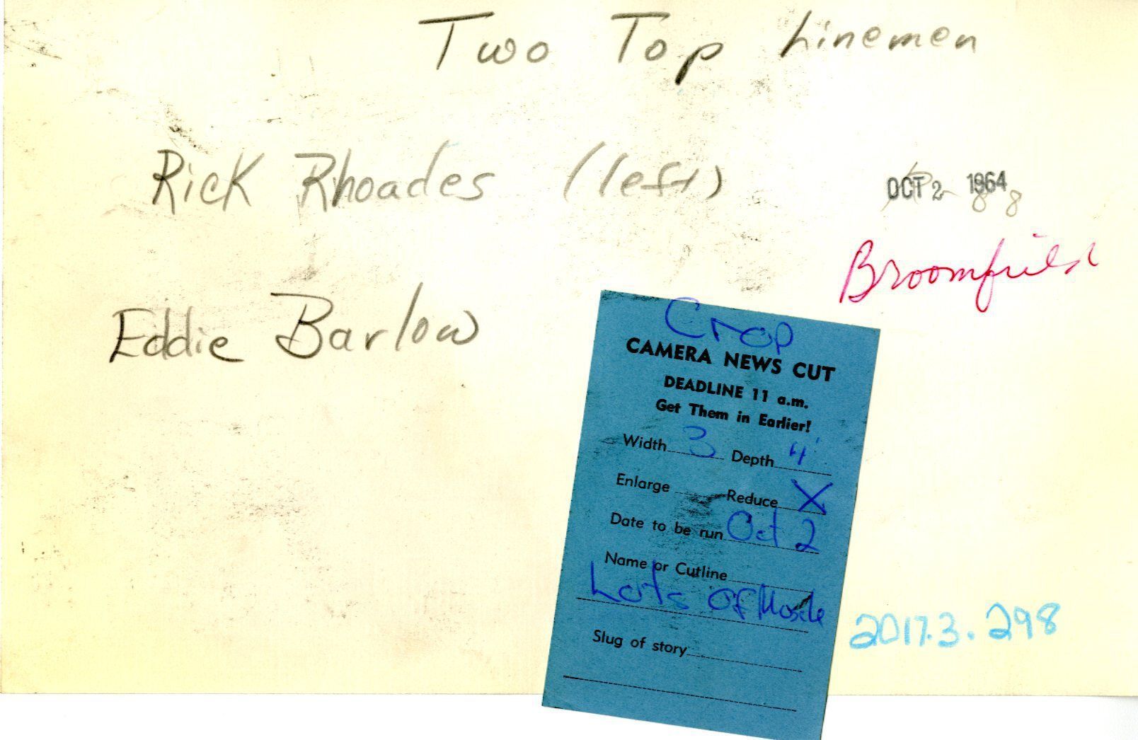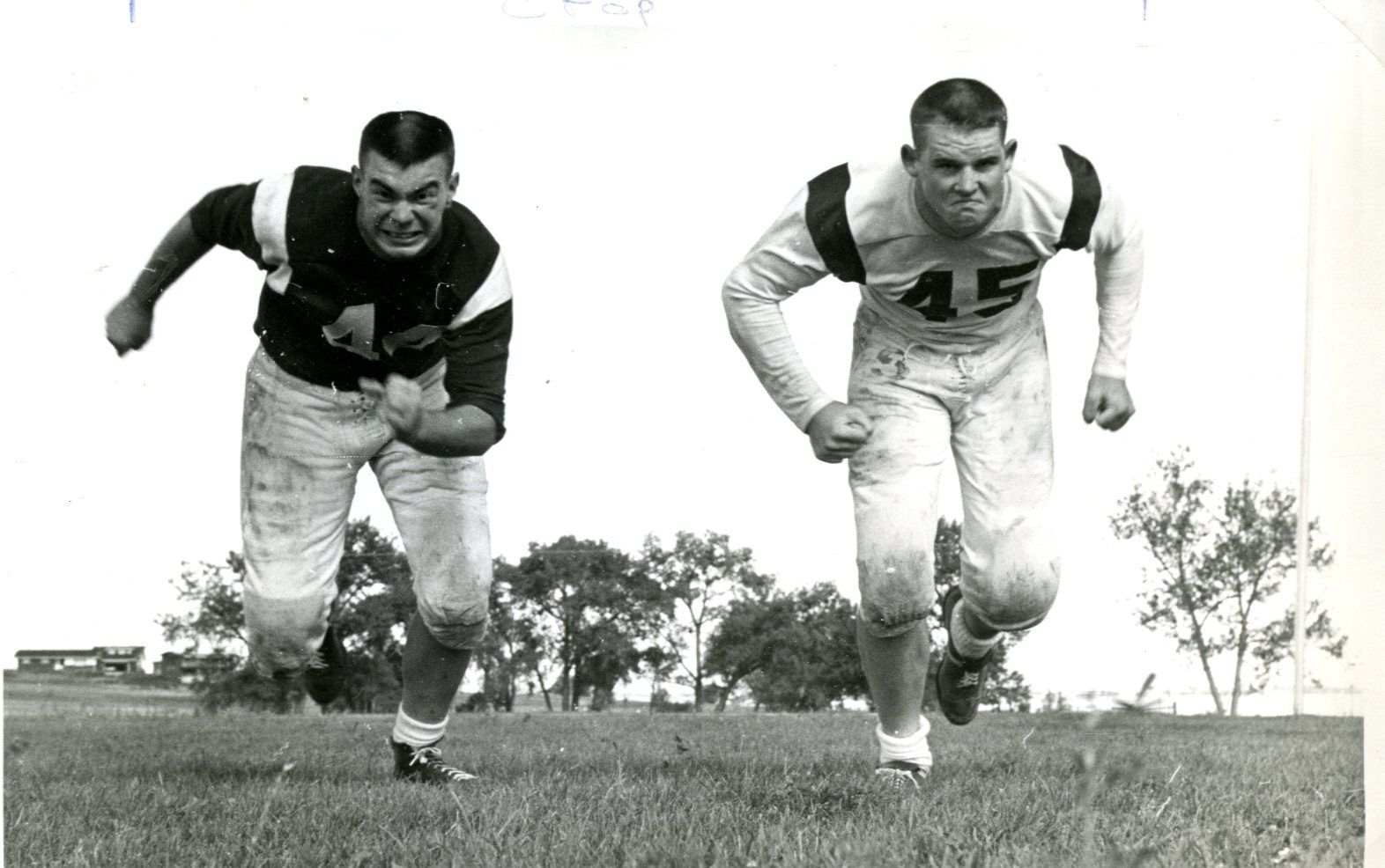 Black and white photo of two top linemen, Rick Rhoades (left) and Eddie Barlow, from Broomfield. Both in school uniforms racing down field.
