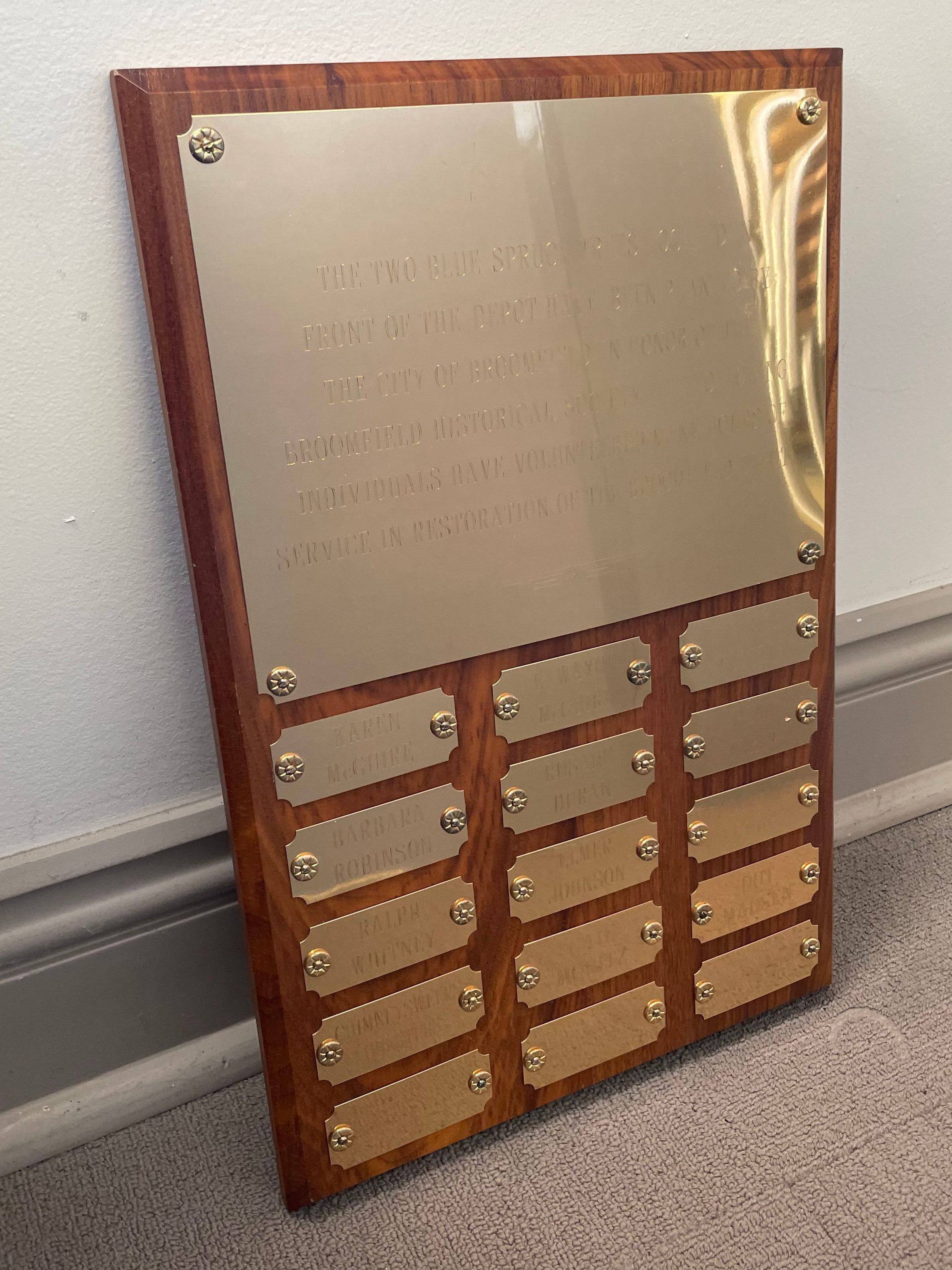 Plaque, gold on wood. Reads "The two blue spruce trees located in front of the Depot have been planted by the City of Broomfield in honor of the Broomfield Historical Society. The following individuals have volunteered many hours of service in restoration of the Broomfield Depot." 15 smaller name plaques are below state, 12 of which have the following names: Karen McGuire, Barbara Robinson, Ralph Whitney, Chimney Sweeps Questers, E. Wayne McGuire, Rosann Duran, Elmer Johnson, Gail Moritz, Eleanor Collins, Paul Furst, Kiwanis Club, Dot Madsen"Collection