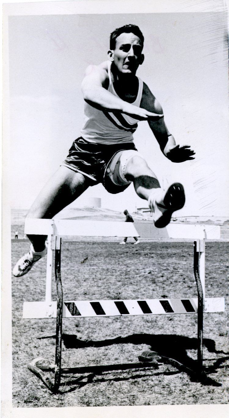 Black and white photo of boy in track uniform jumping a hurdle. Identified as Brent Sutherland of Broomfield High School, class of 1964.