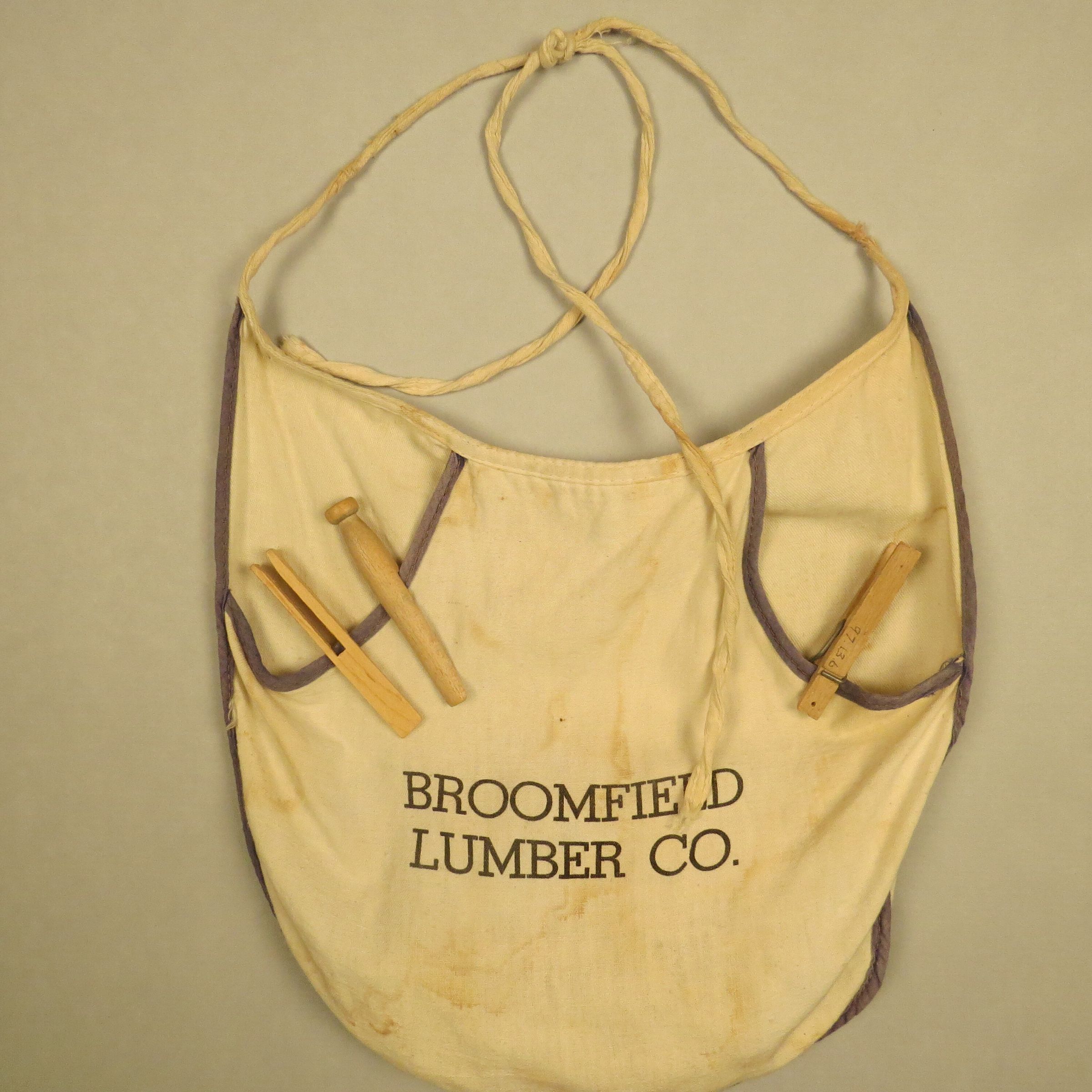 This is an apron and 33 wooden clothespins. The apron is made of an off-white canvas material in a semi-circle shape with the whole front section being an interior pocket accessed at the top corners with another semi-circle. The outside of the pocket opening and edge have been bound with a navy material. The ties around the waist are small and simply a twill tape. Apron measures 13" (w) x 14" (l). The clothespins that were found with this apron were placed in a plastic bag in the same box the apron is stored in.