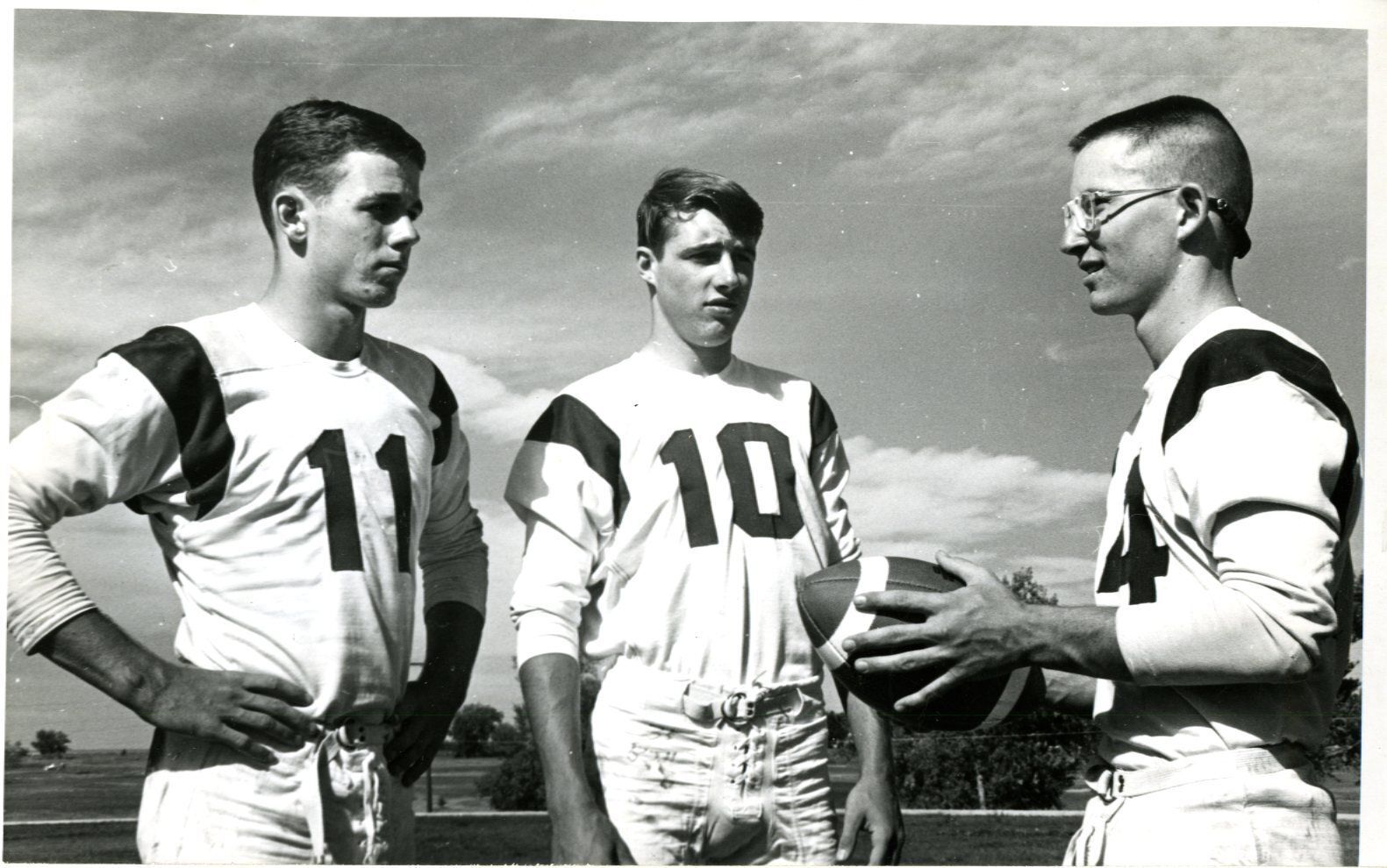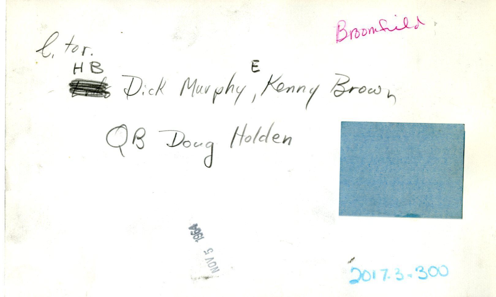 Black and white photo of three football players in uniform. Left to right HB Murphy, E Kenny Brown and QB Doug Holden (holding footbal) in field.