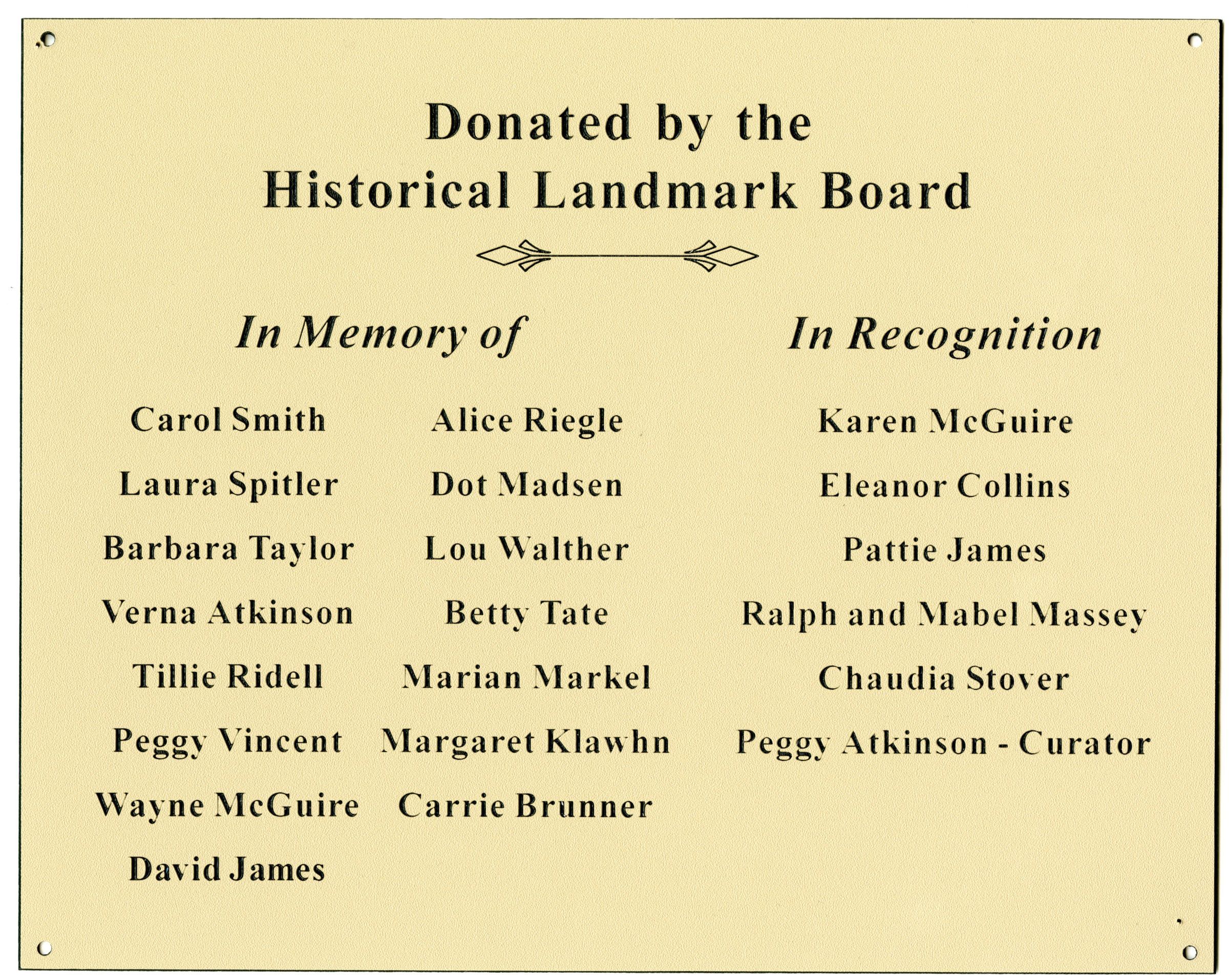 The right side says, "In Recognition" (the people who perhaps are still living). Karen McGuire, Eleanor Collins, Pattie James, Ralph and Mabel Massey, Chaudia Stover, and Peggy Atkinson (Curator).Collection