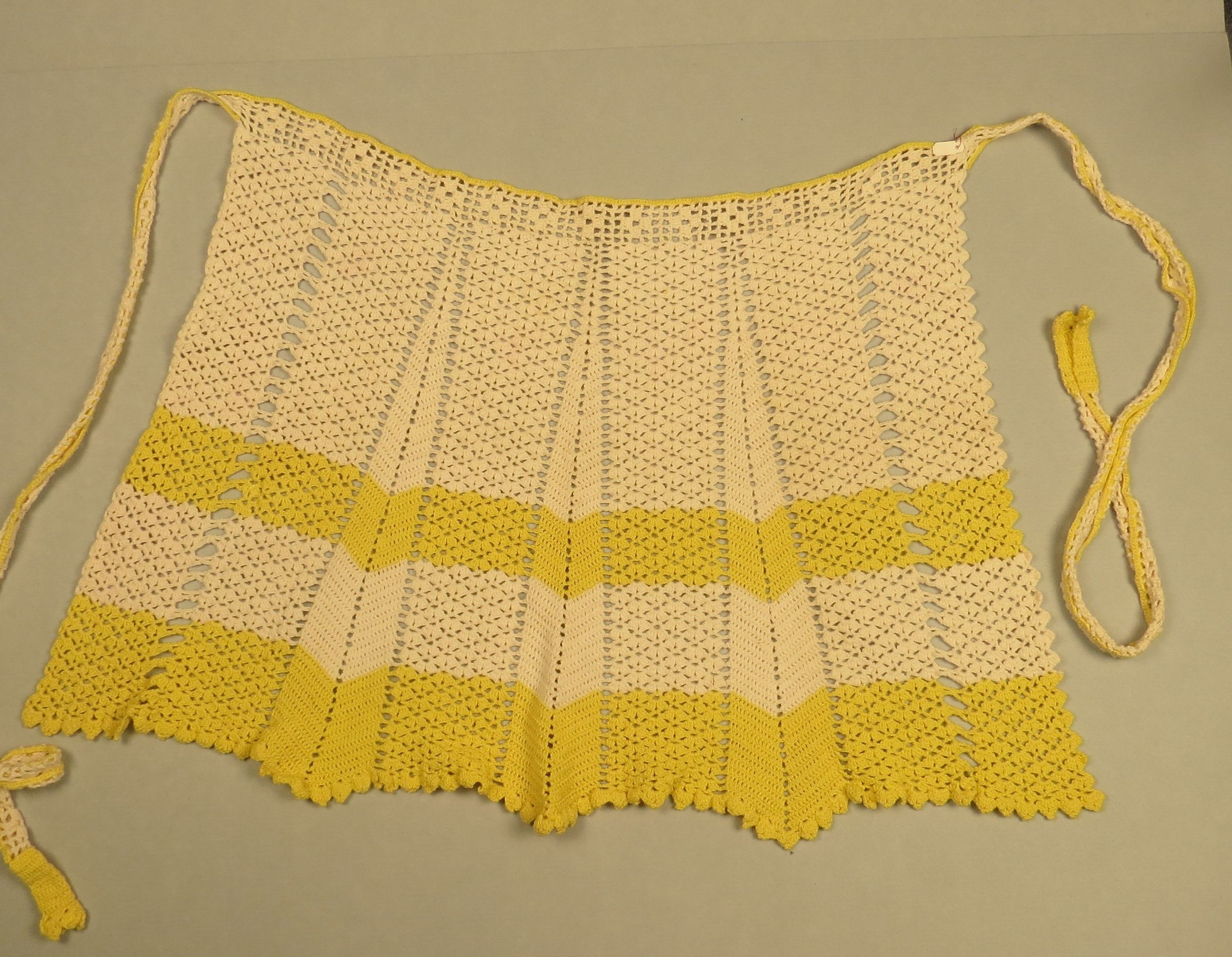 Ivory and yellow crocheted half-apron. The main skirt portion is ivory with two yellow stripes at the bottom. There is also yellow edging around the entire outside including the ties. The skirt was done in rectangle and godet shapes to create a flared skirt that is wider at the bottom and narrower at the waist. Apron measures 16" (w) x 28" (l).Collection