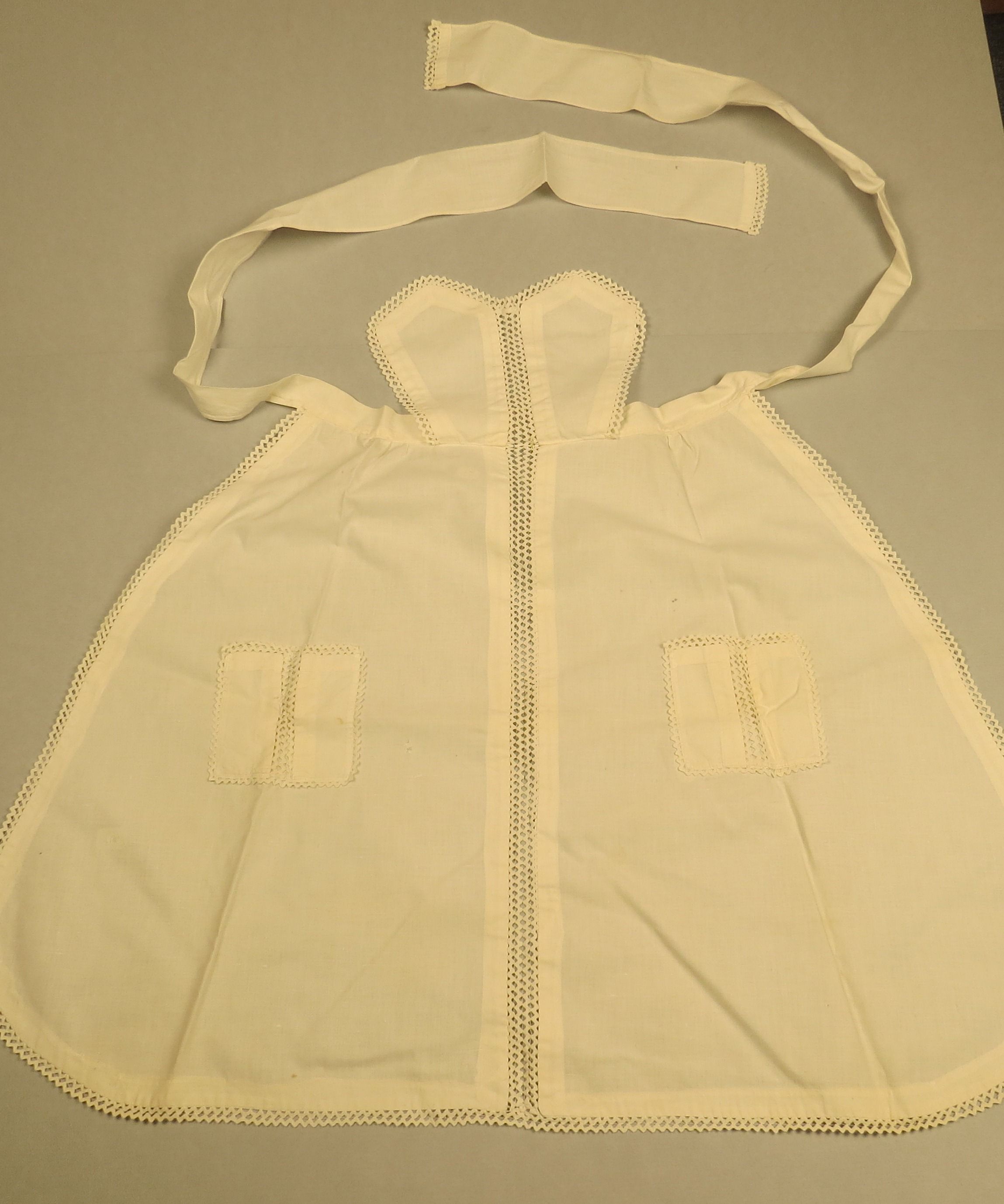 White plain weave material in a pinner-style apron with sweetheart bib portion that would have been pinned to the wearer's clothing at top. The entire outside as well as the center front has been edged with rick rack that has been sewn at center front to create a openwork look. There are pockets on either side of center front on the skirt portion. Apron measures 15" (w) x 25" (l).Collection