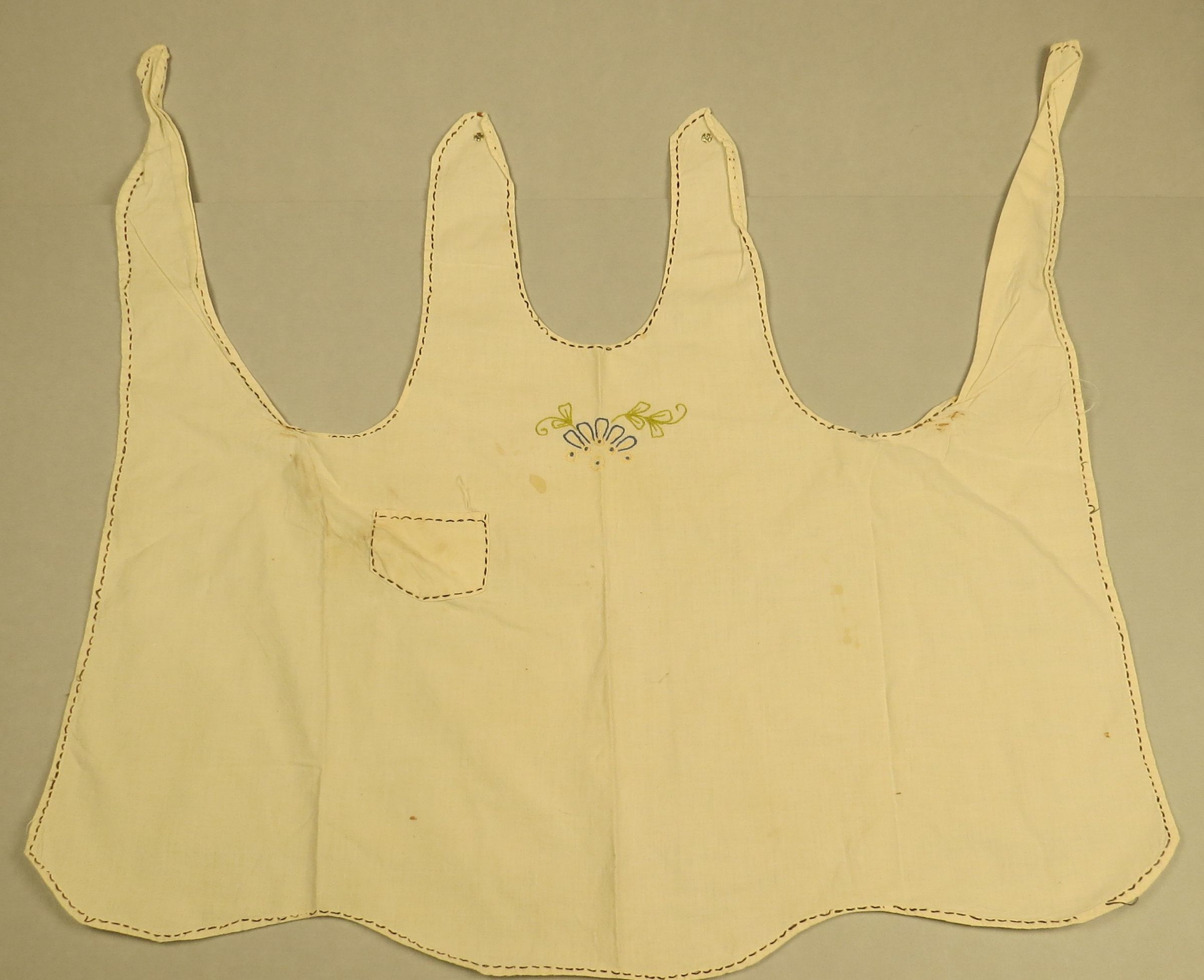 Off-white 27"(L) x17"(W) apron (possibly feed-sack material) that is in a full-front style that would attach at both shoulders and around the neck. There is a small pocket at wearer's right chest front. A small floral arrangement is embroidered at top center front.