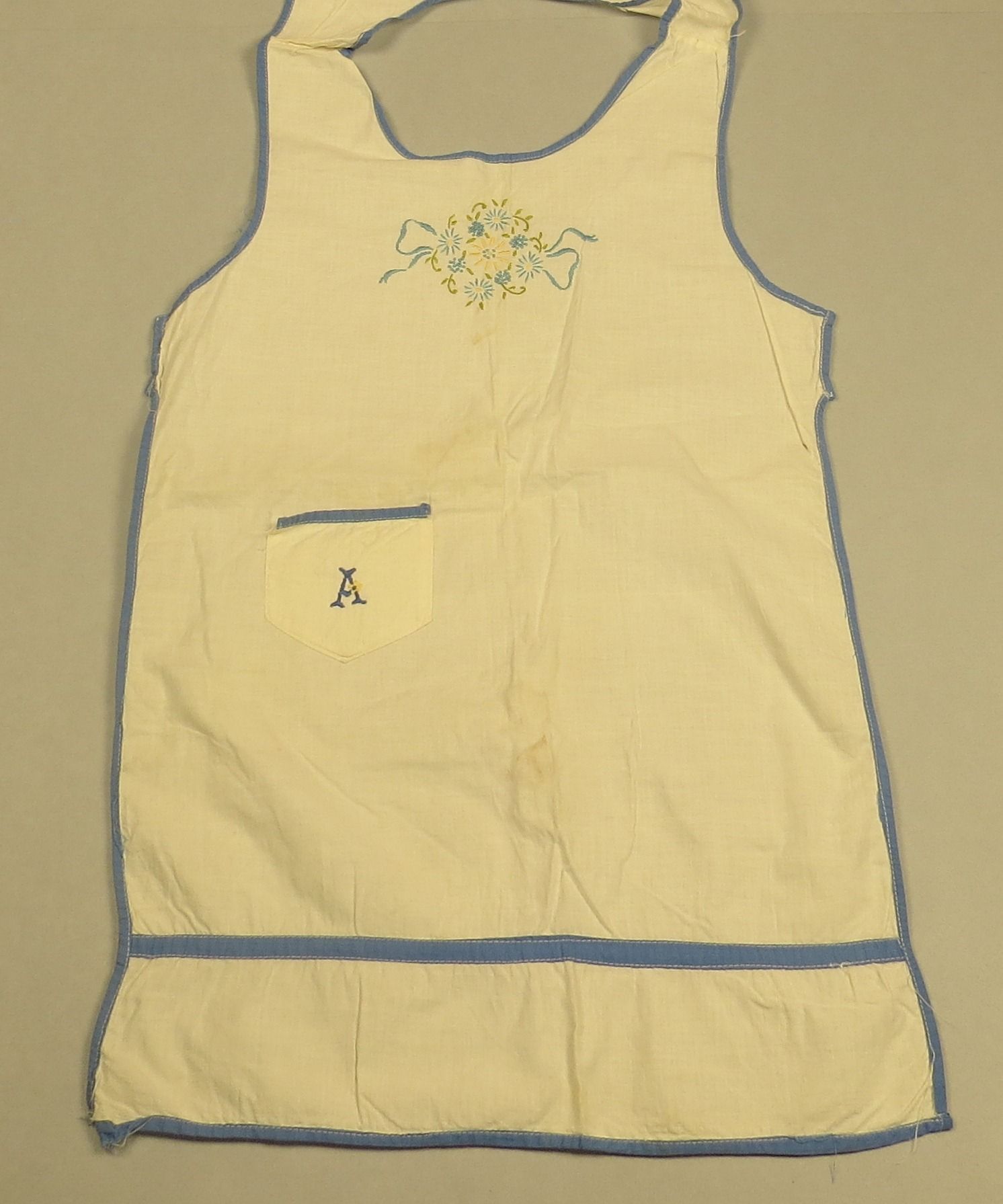 This 16"(W) x 37"(L) muslin apron is a pinafore style with both full front and back that attach at the shoulders and may have been tied or pinned at sides. It is completely edged in blue bias. There is a small pocket at wearer's right front, this is embroidered with an "A". At top front is an embroidered floral arrangement.Collection