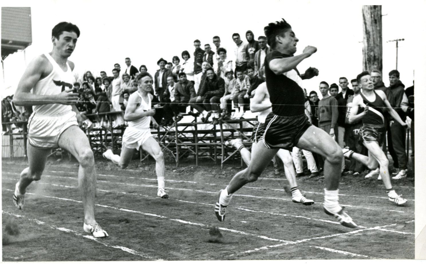 Broomfield High School young men running the dash with a crowd of people watching from bleachers.