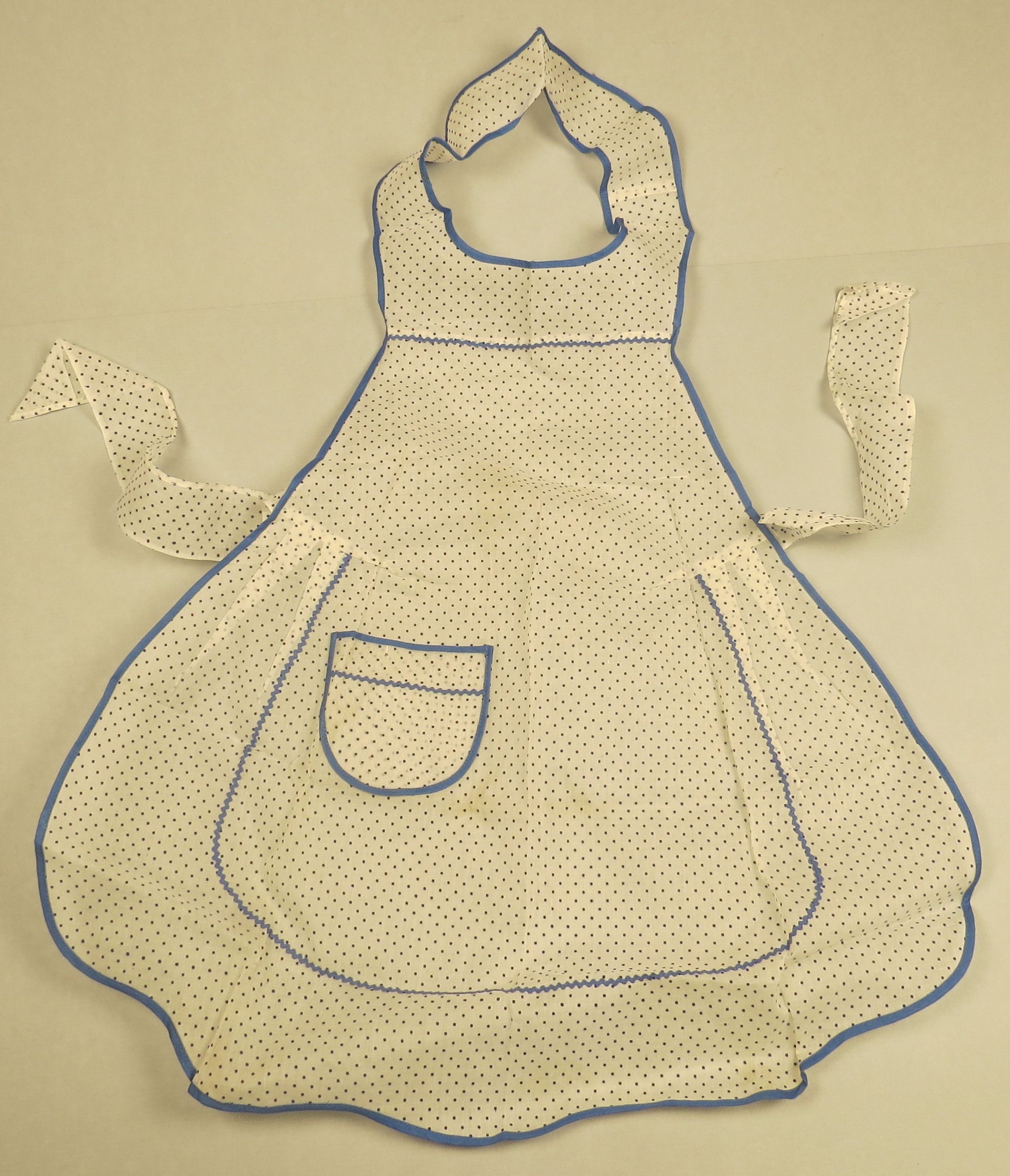 Organdy swiss dot in a bib-style apron with section around neck. The skirt is voluminous and would have been worn with a fuller skirt. There is blue piping accents that give a double apron affect and gives definition throughout the front. Apron measures 13" (w) x 14" (l).Collection