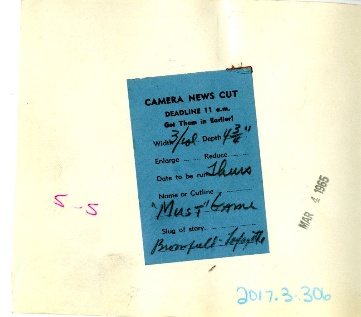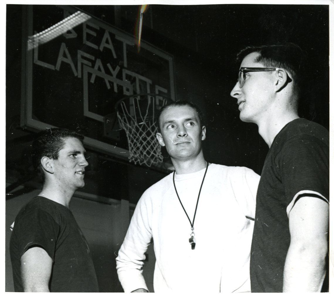 Broomfield High Basketball player talking to to coaches about beating the Lafayette Team. Identified as Keith Hughes, Coach Al Gardner, and Doug Holden. Possibly taken in 1965. Both are in class of 1965.