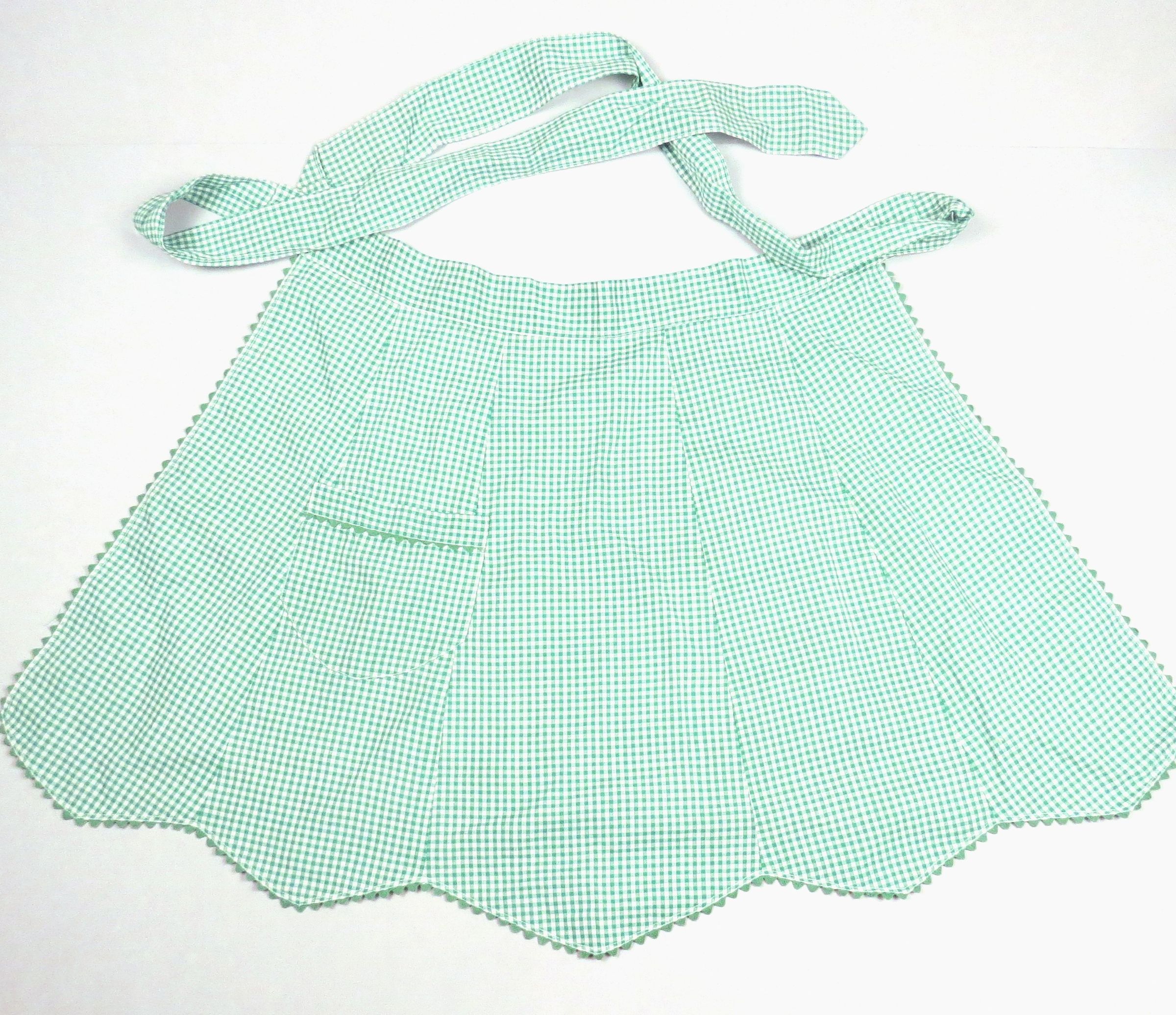 Green and white half apron with shaped panels that are pointed at bottom to create a lower scalloped edge and gave the skirt portion a flared shape. There is a pocket at wearer's right hip. Apron measures 12" (w) x 34" (l).