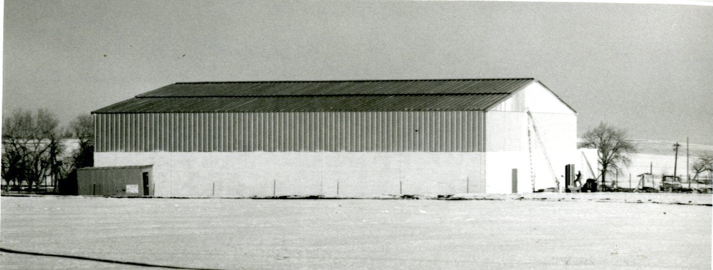 Photo of a big long building out in a field that was the Broomfield Gym.