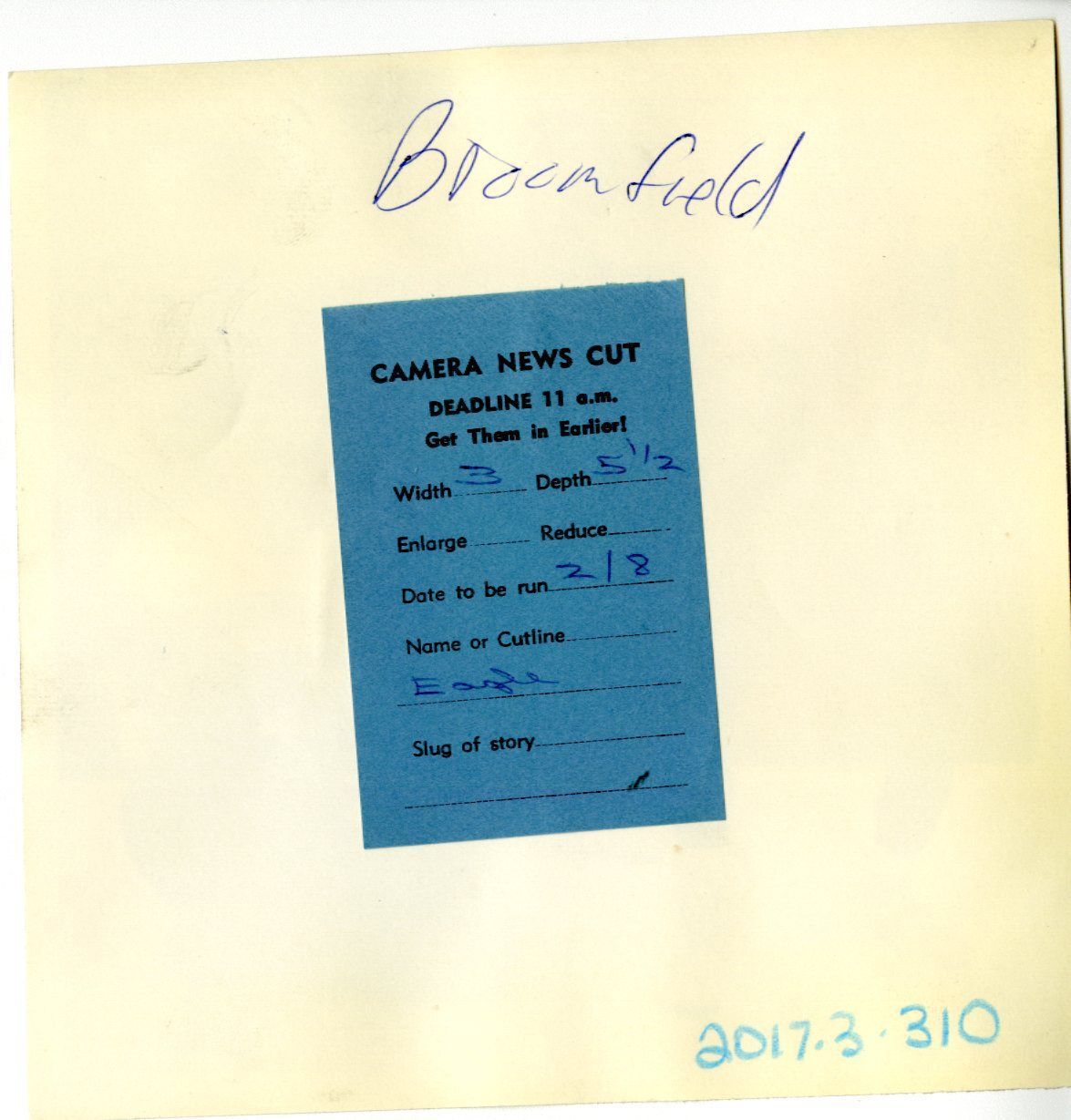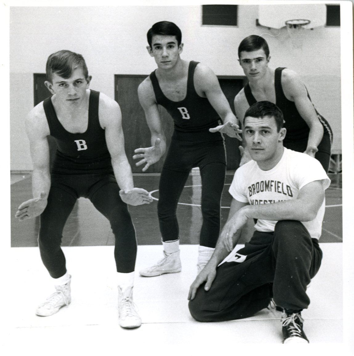 Three Broomfield High wrestlers with their coach on a mat at the school gym. Identified in 2023 as "Wrestlers Eric Gunderson, Ray Corn, Pat Noyce, Coach Bill Gardner" 1967. All 3 wrestlers were class of 1967.
