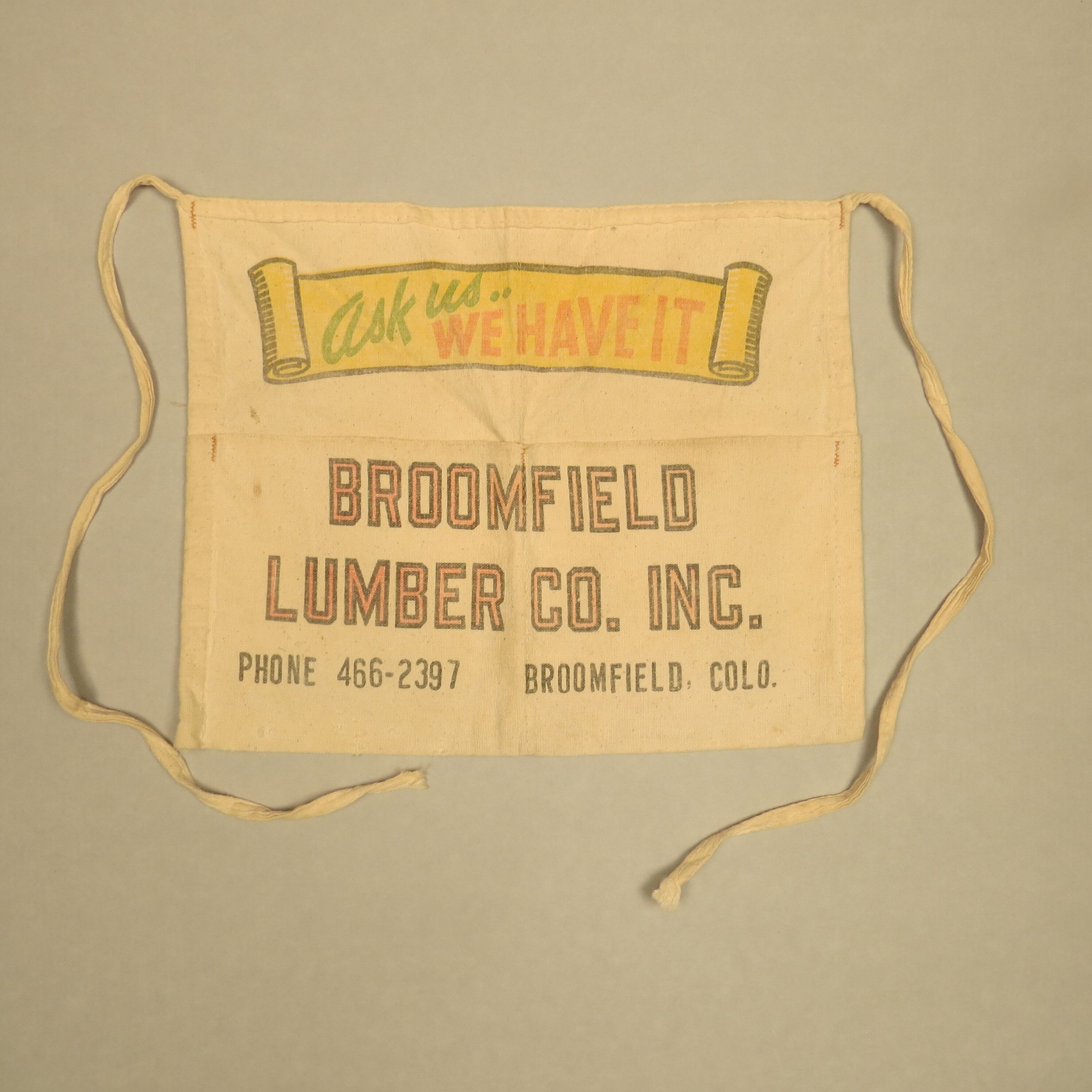 Cotton canvas half apron in the shape of a rectangle with narrow ties. On the front in a scroll graphic reads "Ask Us. We Have It" Through the middle of the front reads "Broomfield / Lumber Co. Inc." and the number and location. The apron measures 11" (w) x 13" (l).