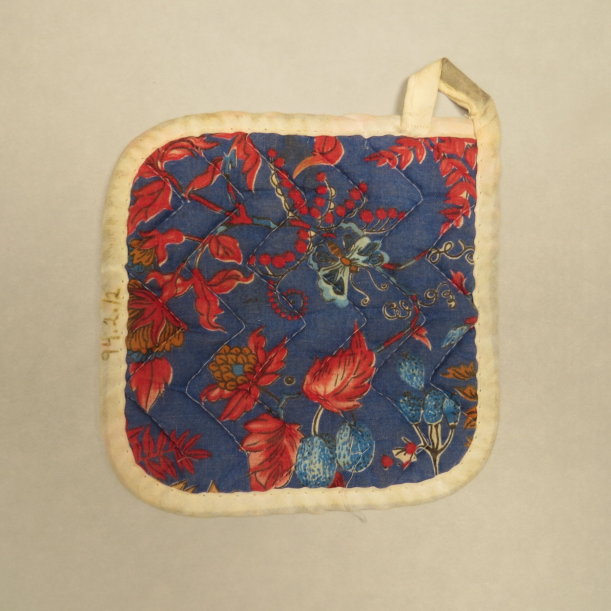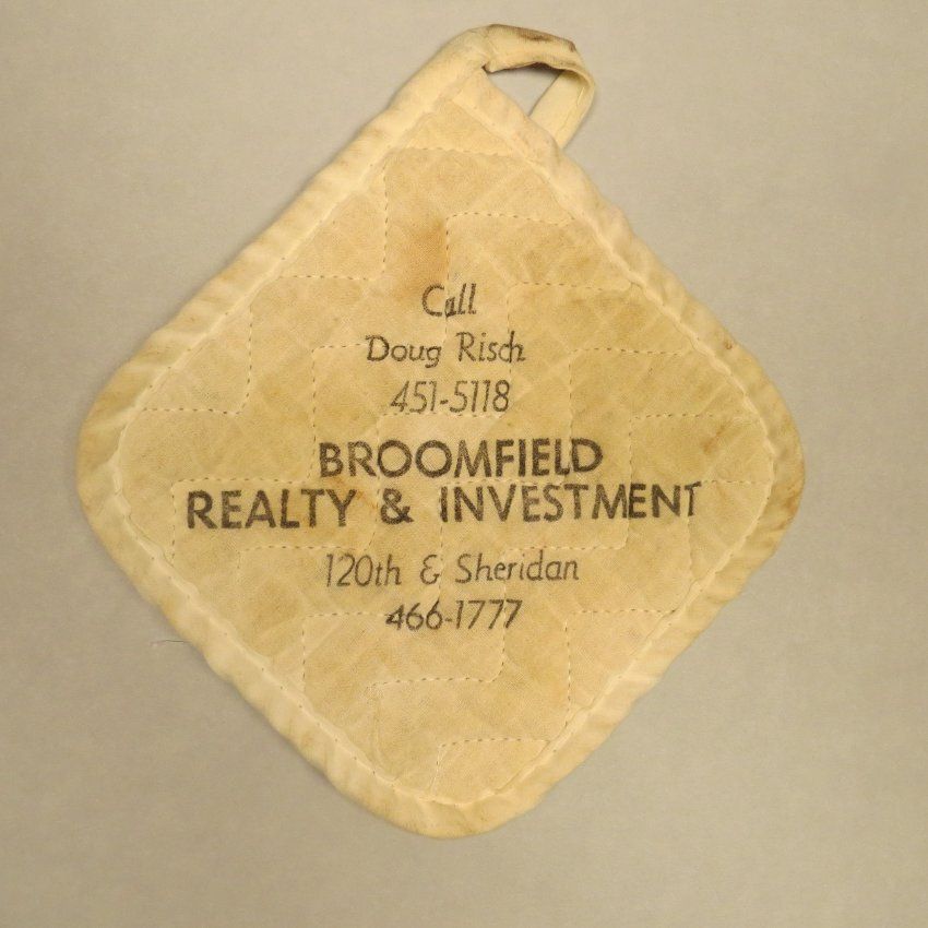 This is an advertising potholder with bright colored fabric on the back and on the front is text that reads "Call / Doug Risch / 451-5118 / Broomfield / Realty & Investment / 120th & Sheridan / 466-1777". The potholder measures 6" (w) x 6" (l). There is a magnet in the hanging loop. Potholder measures 6" (w) x 6" (l).