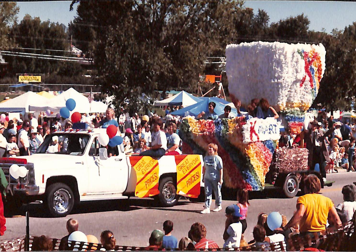 Item is a photograph printed on Kodak paper taken during the 1989 Broomfield Days celebration. A white K Mart truck is driving down the street during the parade, draped with yellow and red banners reading "Great Everyday Prices" and hauling a colorful float with children sitting on it. Red, blue, and white balloons adorn its bumper and windows, and crowds line both sides of the street. Blue and white tents are visible amongst the trees in the background, no doubt holding other festivities.Photograph Details
