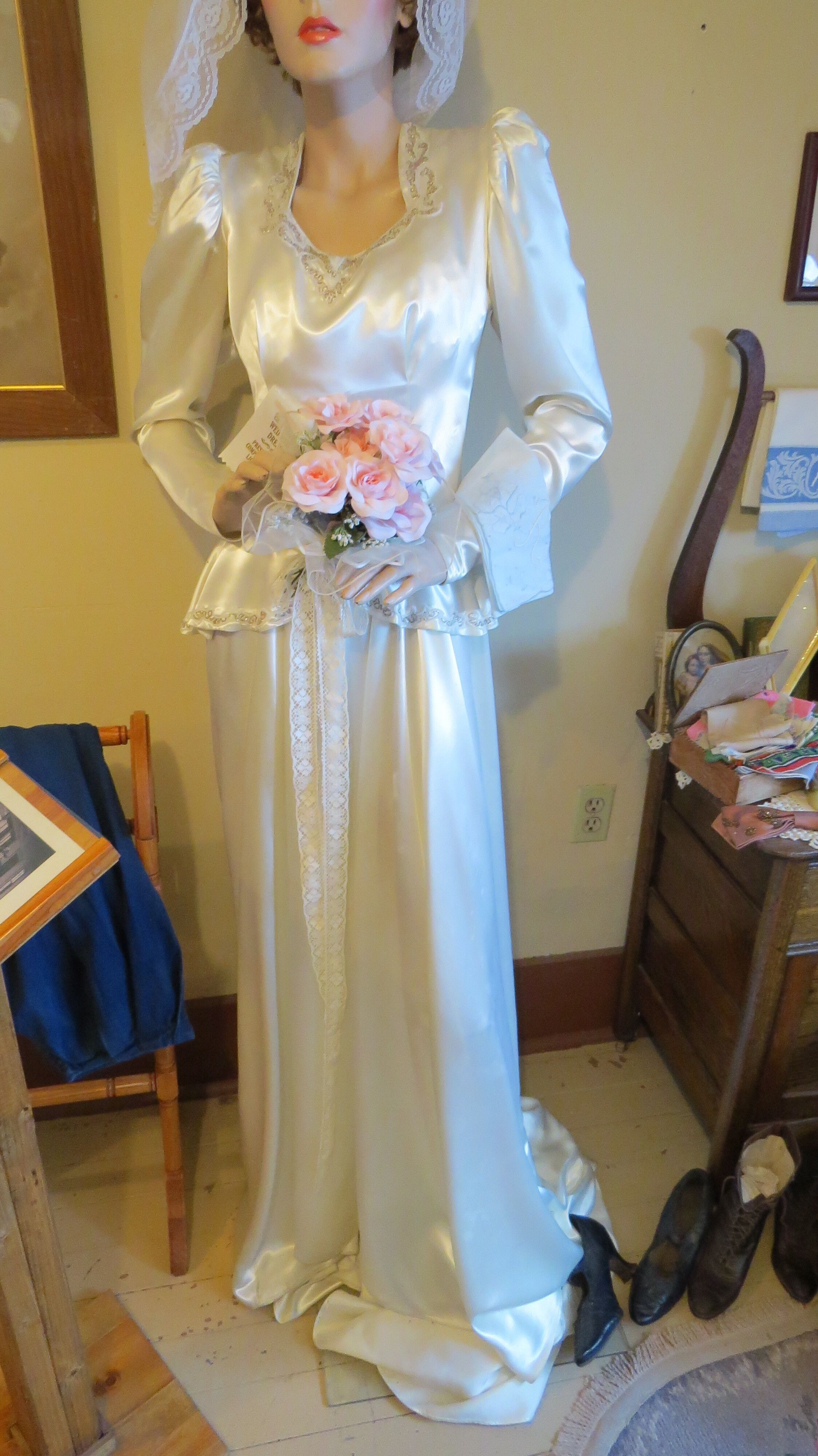 Ivory wedding dress with fitted sleeves that are gathered at armseye to create a voluminous shoulder. The bodice is fitted with a natural waist and A-line skirt. There is a train in back and self-fabric buttons as closure in the back of bodice. Is likely Rayon but could be silk. Satin weave.