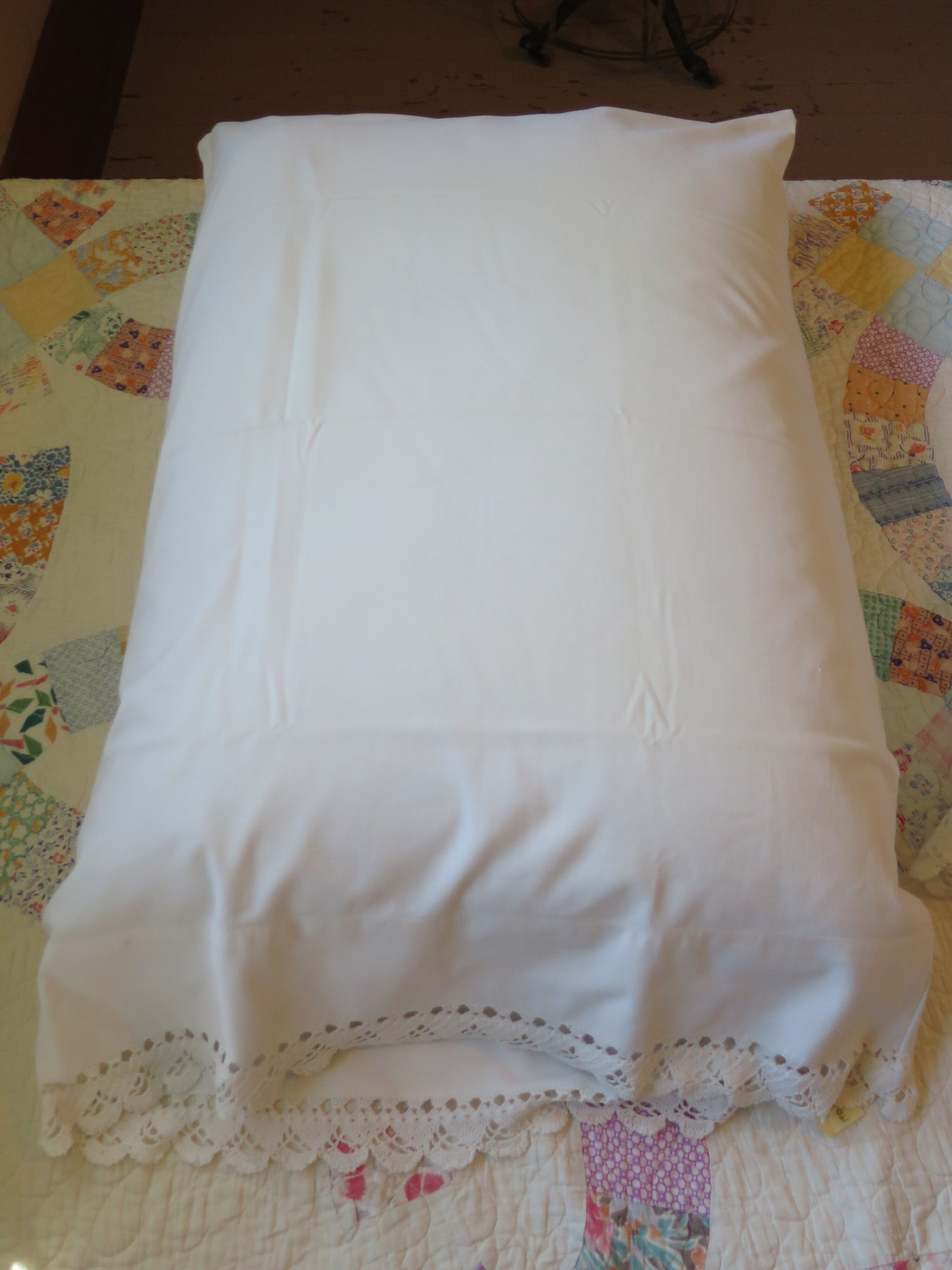 Off-white pillowcase with deep hem at open edge that has been edged with an almost two inch decorative crochet trim. This pillow matches 1985.19.2. Pillow measures 20" (w) x 30" (l).Collection