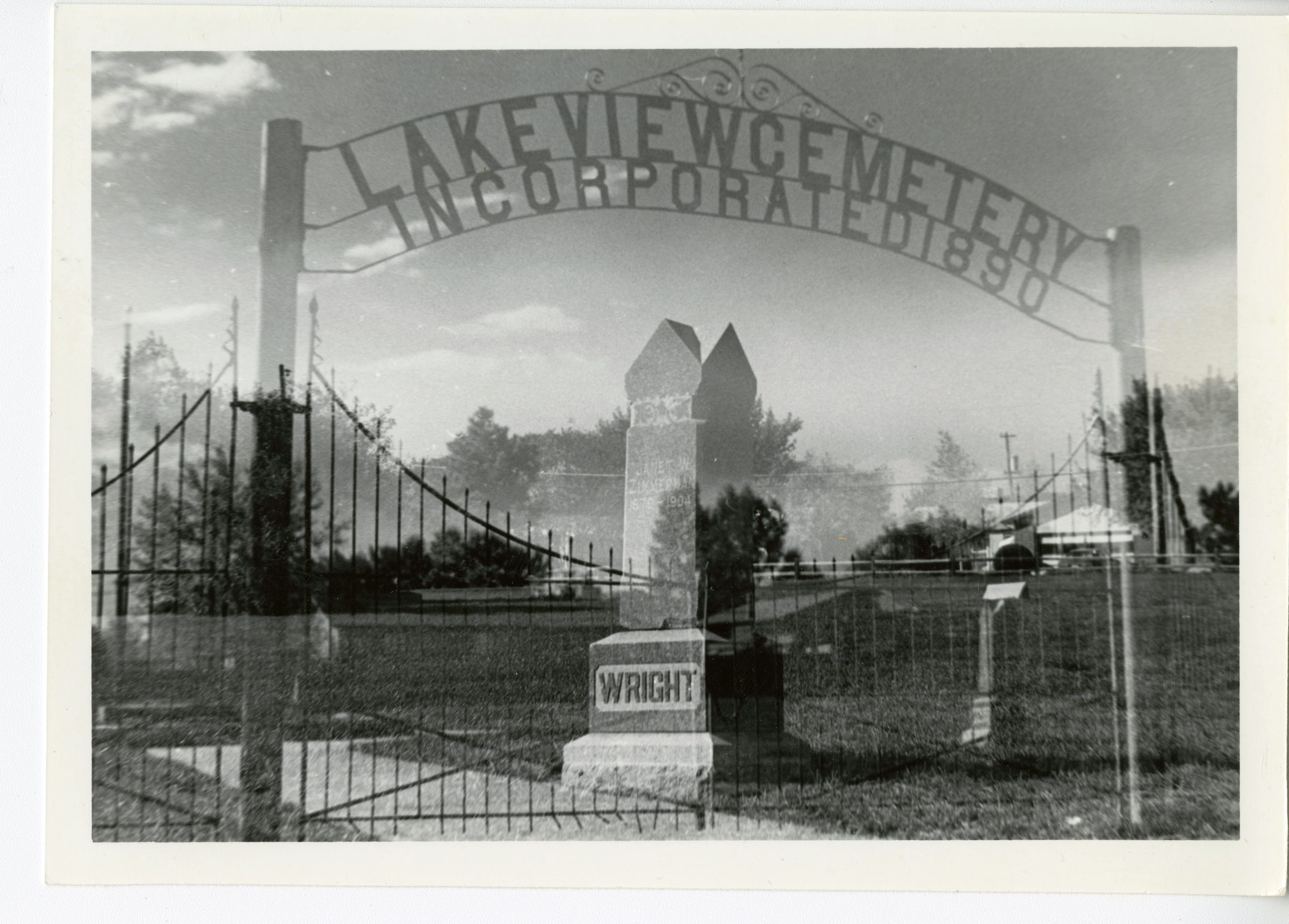 Black and white photo of the Lakewood Cemetery entrance with the Wright monument shown in photo circa 1993.