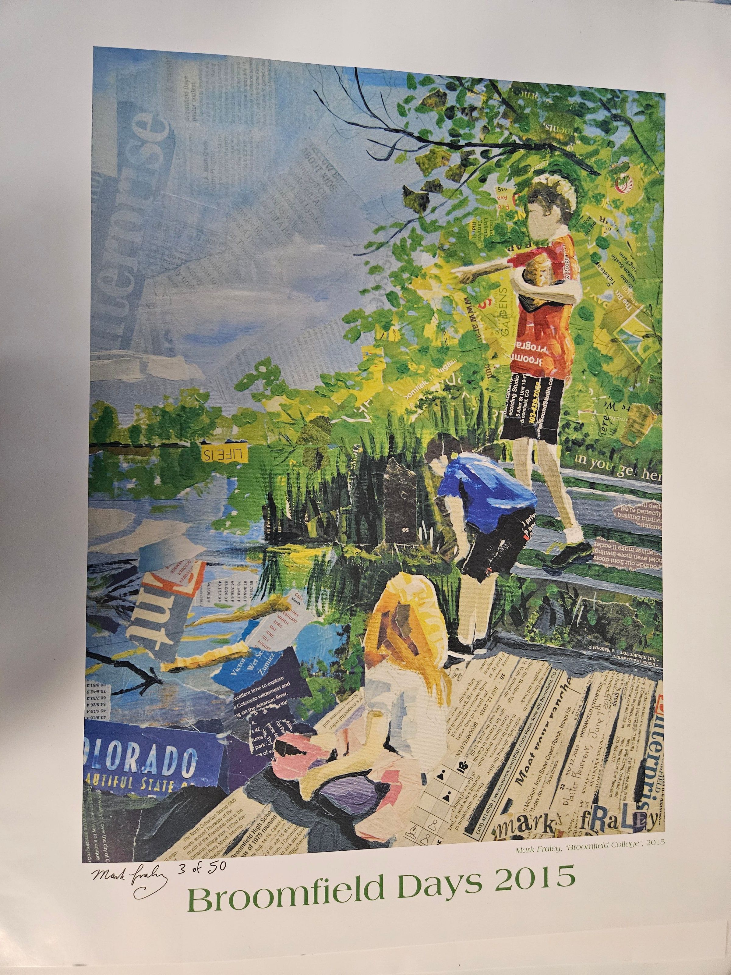 Item is a poster from the 2015 Broomfield Days event. The image featured on the poster consists of three children standing on a dock, looking into a blue river surrounded by green reeds. The image appears to have been painted on a collage of newspaper clippings, but the poster itself is printed on paper. The artwork is signed by Mark Fraley, the creator, and titled "Broomfield Collage," labeled the third out of 50 posters. The green text below reads "Broomfield Days 2015."Collection