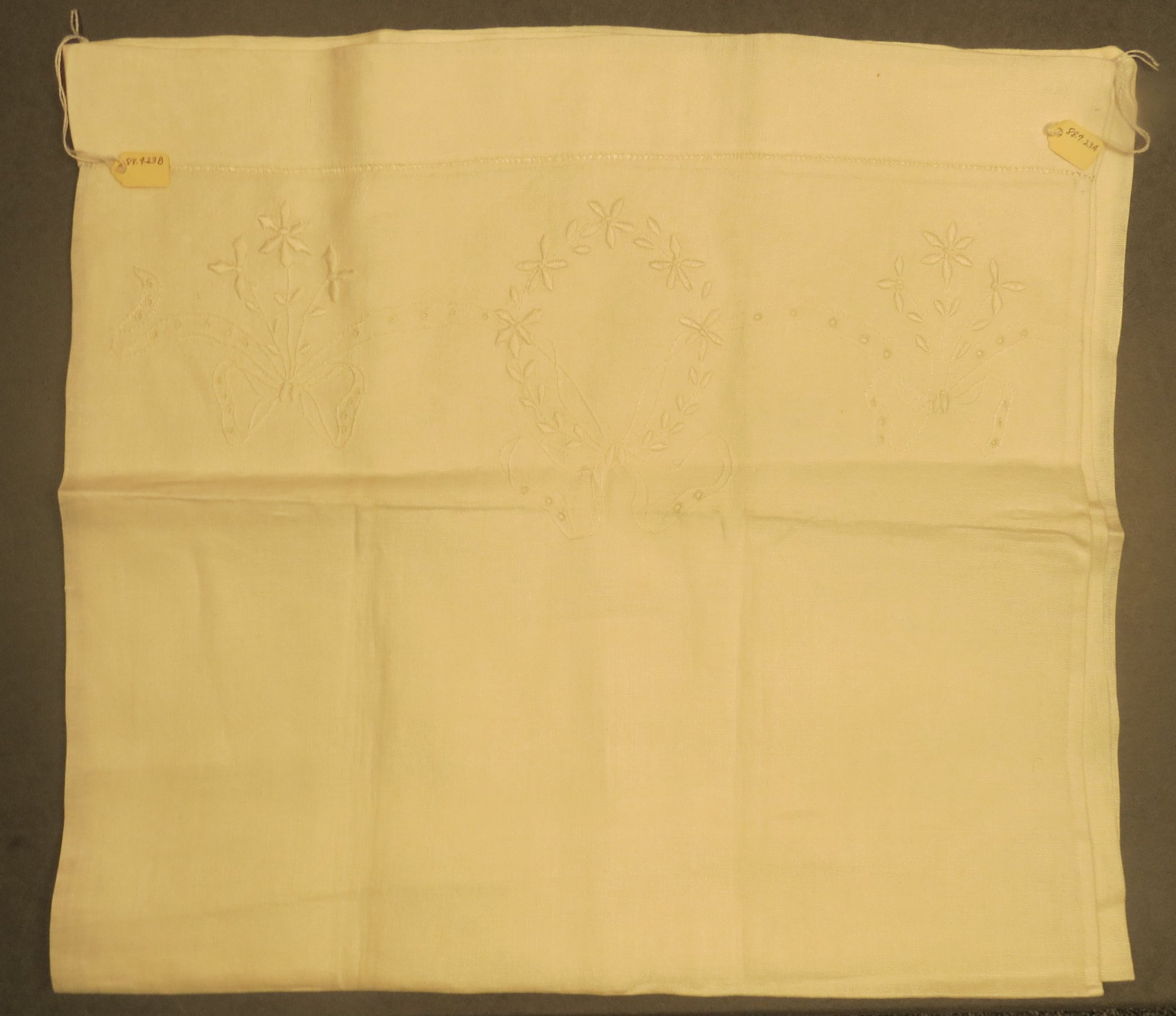 This is a white calendared cotton pillowcase with a hemstitch at the open end and an embroidered panel across the short open end that shows hole stitching and 3-D leaves. Pillowcase measures 18" (w) x 31" (l).Collection