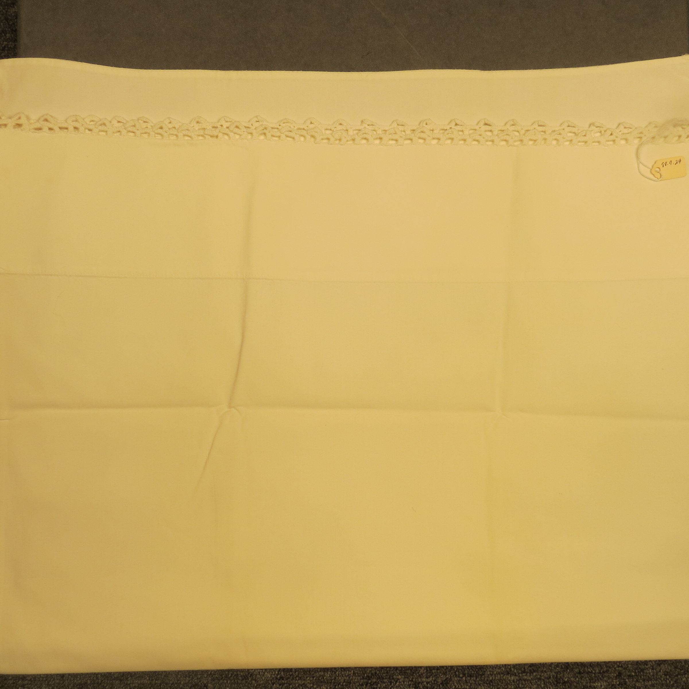 This is a white pillowcase of high thread count cotton. The open edge has been crocheted in a circular pattern with a thick thread. Pillowcase measures 19" (w) x 30" (l).
