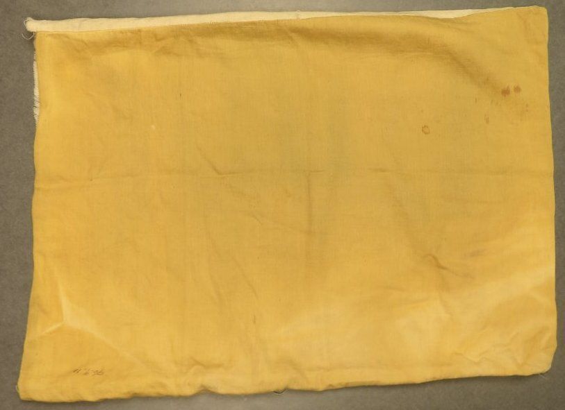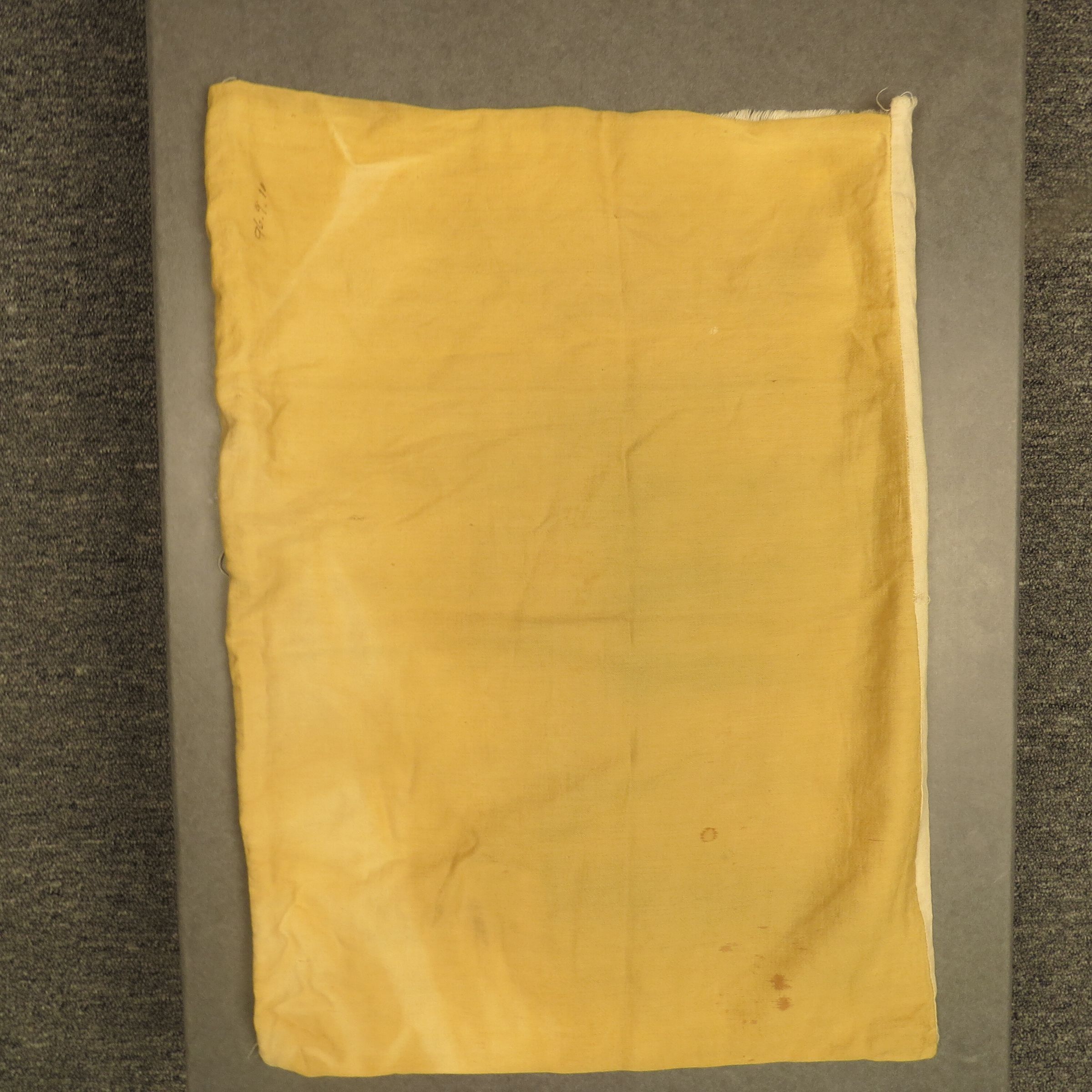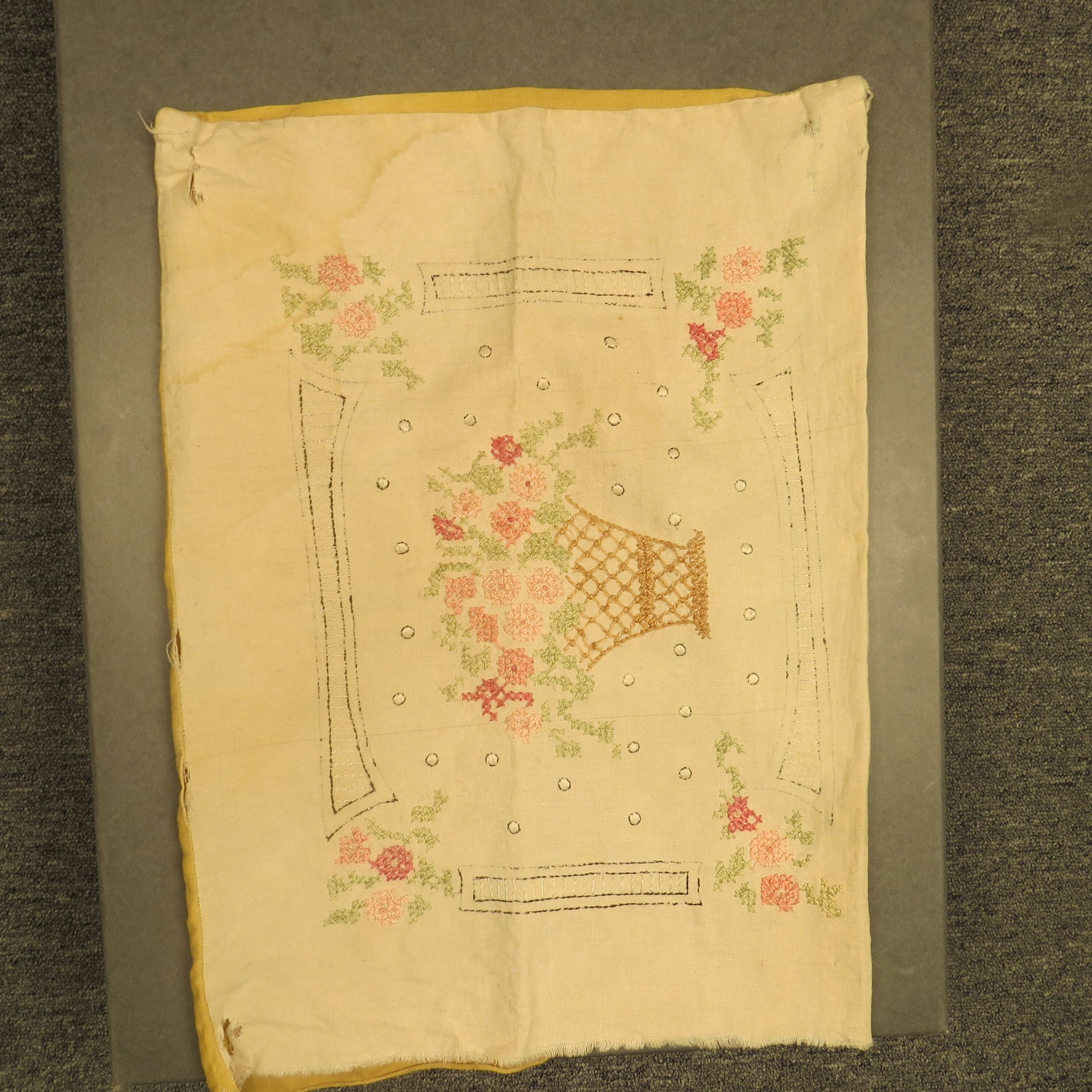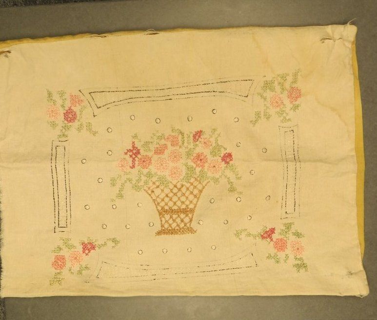 This appears to have been a pillow at one time, the inside stuffing or insert is now gone. The left side has been ripped open, this opening is unfinished. The front is a coarse low thread count tan material that has been embroidered with running stitches and cross-stitch in the design of a flower basket with dots surrounding it and a border around it all. The black embroidery thread is in very poor condition and shows signs of general but prolonged use. The back is a sturdy twill material in a deeper yellow tan. Pillowcase measures 15" (w) x 21" (l).Collection