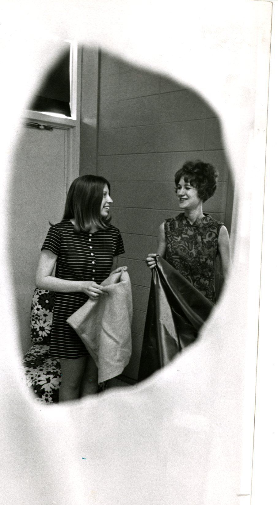 Two young ladies holding what could be table cloths.
