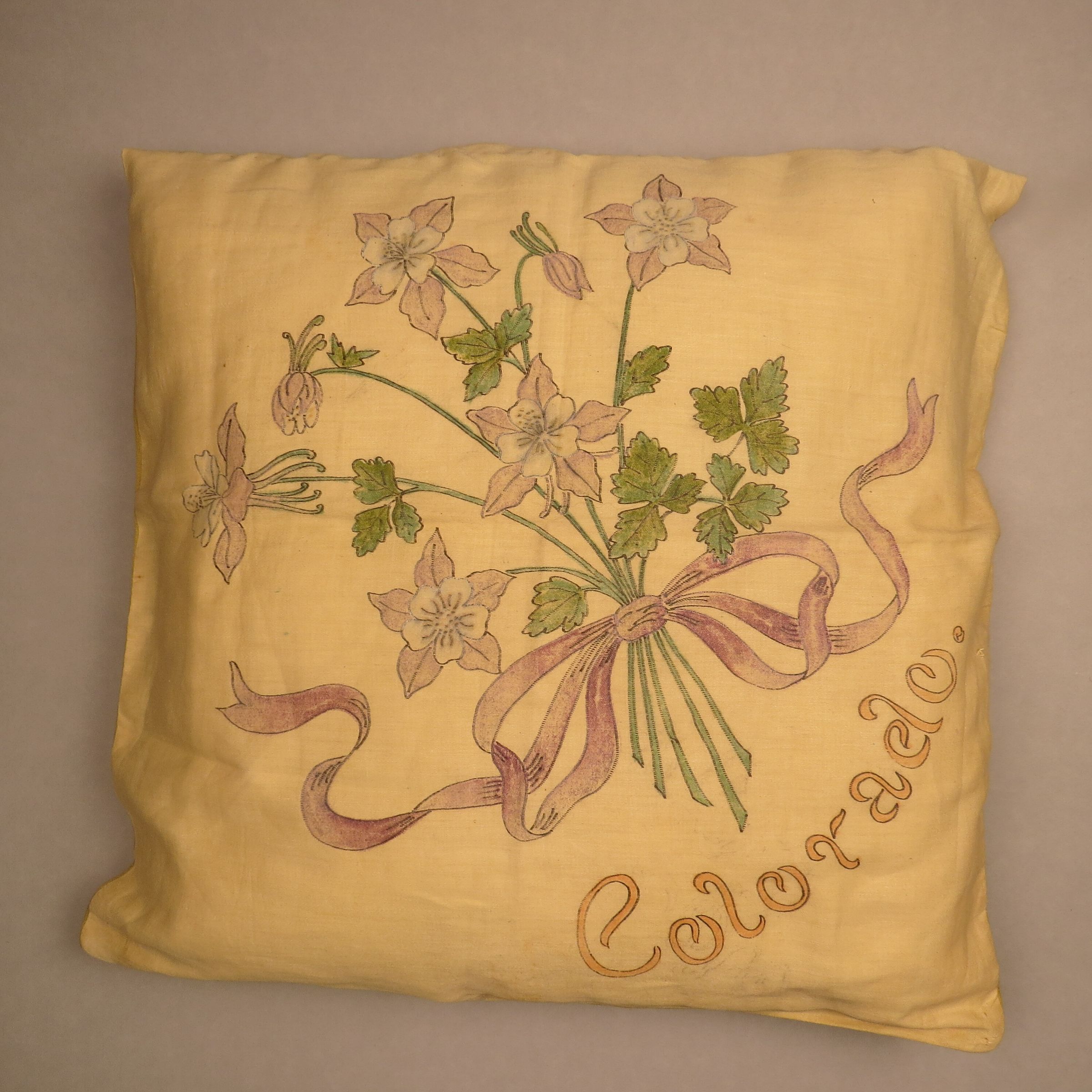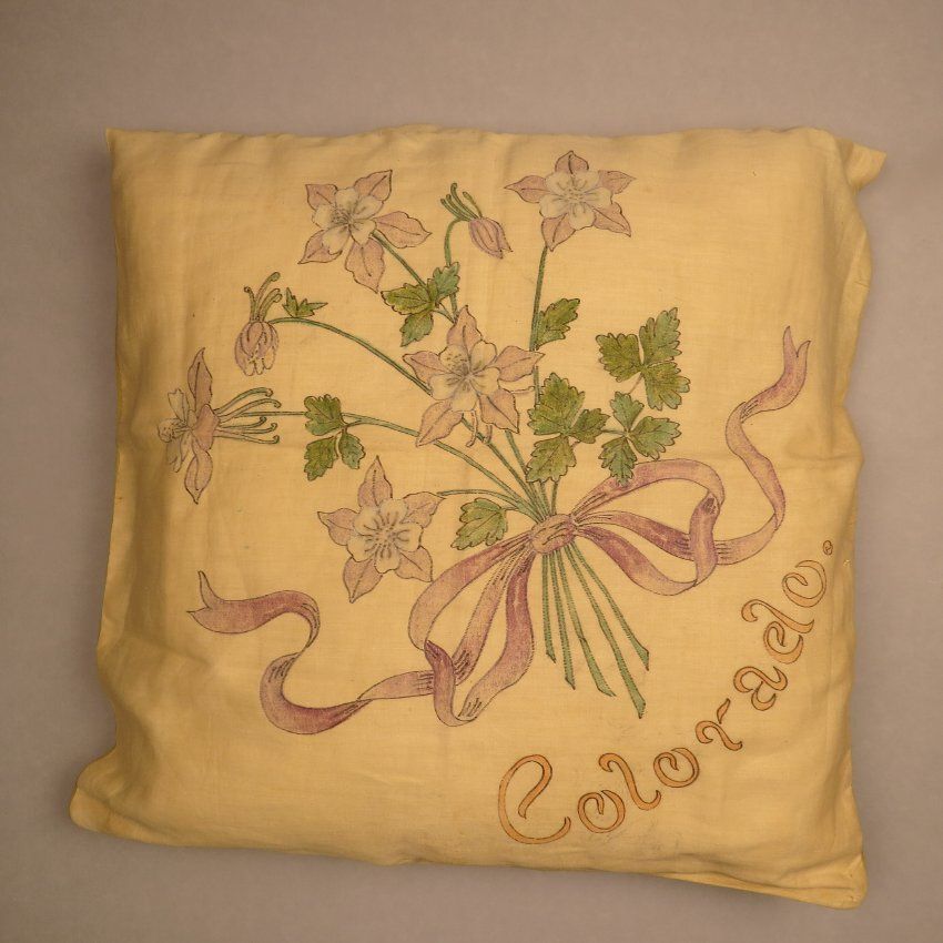 Square decorative pillow with a stamped and painted design on front. There is a bouquet of purple Columbine flowers in the center. The word "Colorado" is written at an angle across one of the corners. The bouquet, which has a purple ribbon, is also at an angle. Pillow measures 19" (h) x 19" (w).Collection
