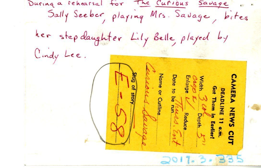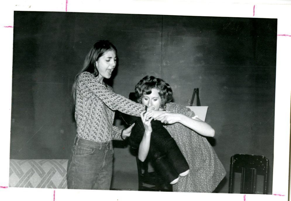 During a rehearsal for The Curious Savage Sally Sweeber playing Mrs. Savage, bites her stepdaughter Lily Belle, played Cindy Lee.