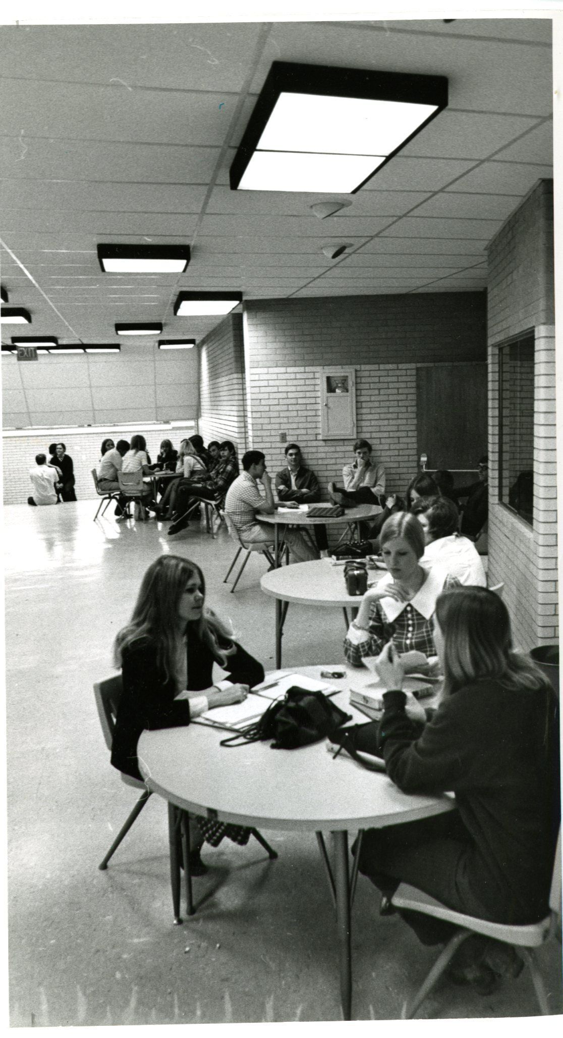 Students sitting at tables in the hallway at school. Visiting and doing homework.