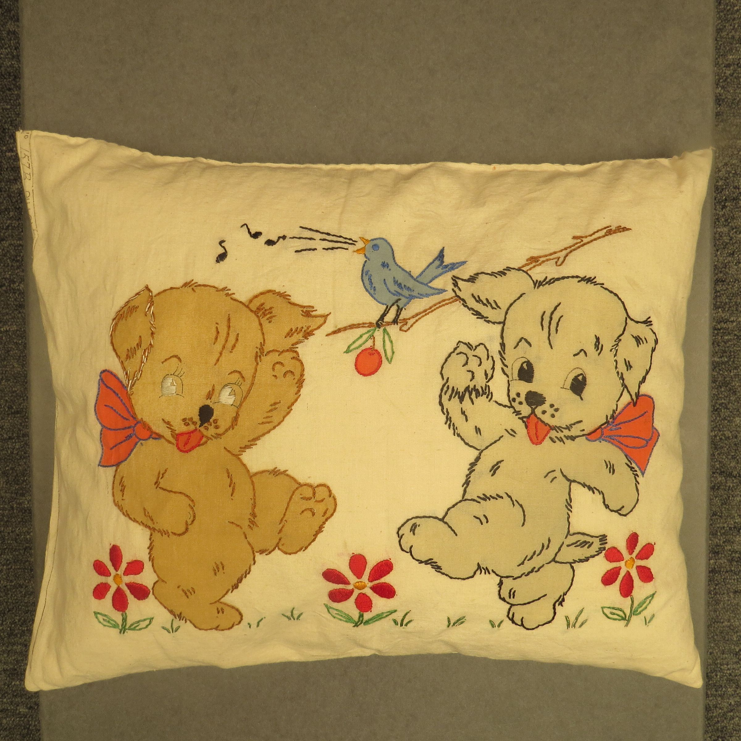 Small child's pillow of coarse cotton that has been printed with a colored design of two dogs, white and brown with red bows and the appearance of dancing, bird, blue with music notes making it appear as though it is singing, and red flowers. Embroidery outlines the characters and creates the flowers and bird at top. Pillow measures 14" (h) x 17" (l) x 2" (w) .Collection