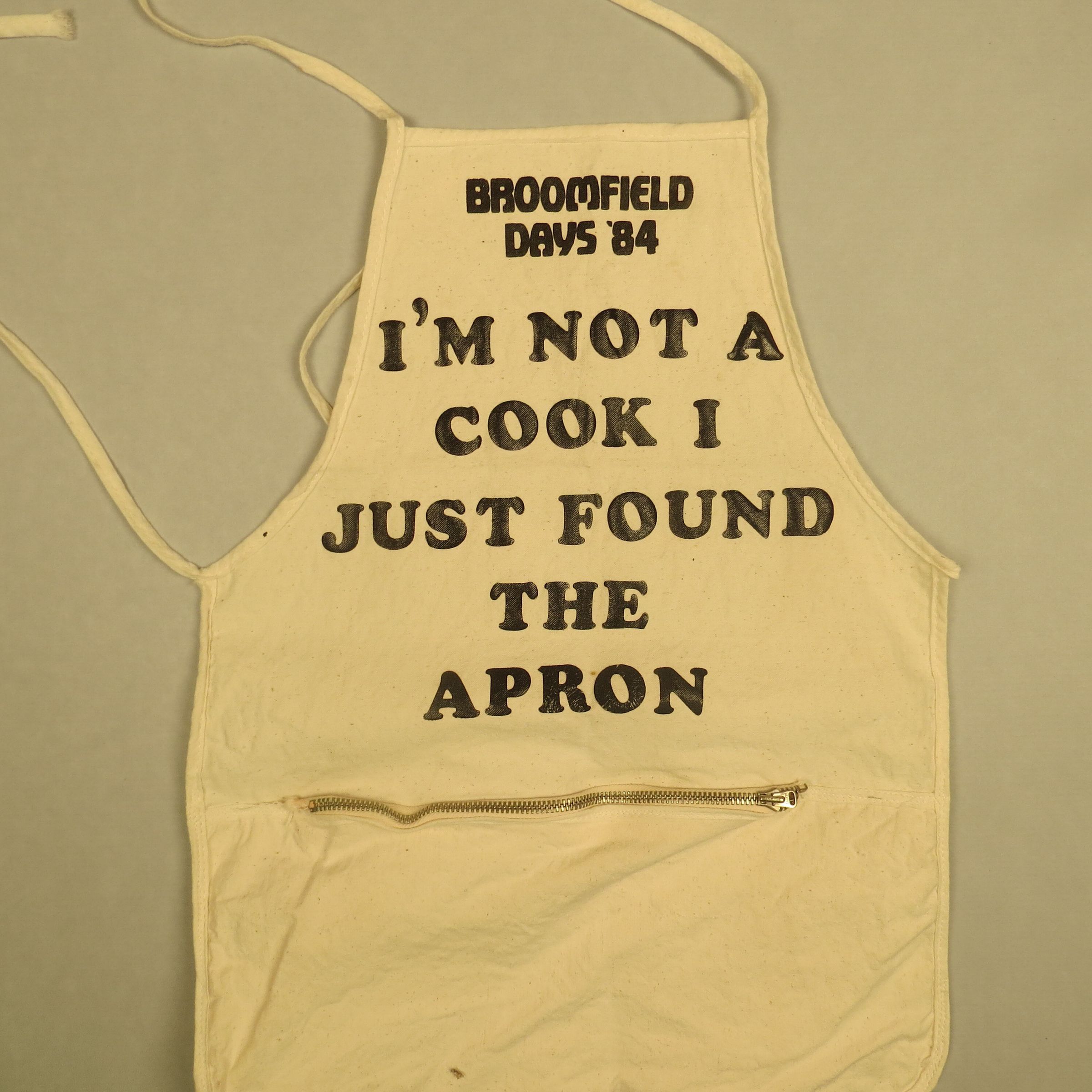White cotton canvas bib-style apron with a zippered pocket section at the bottom of the skirt portion. On the front is stamped the following text: "Broomfield Days '84 / I'M NOT A COOK I JUST FOUND THE APRON. Apron measures 16" (w) x 21" (l)