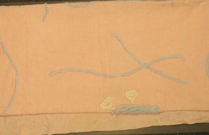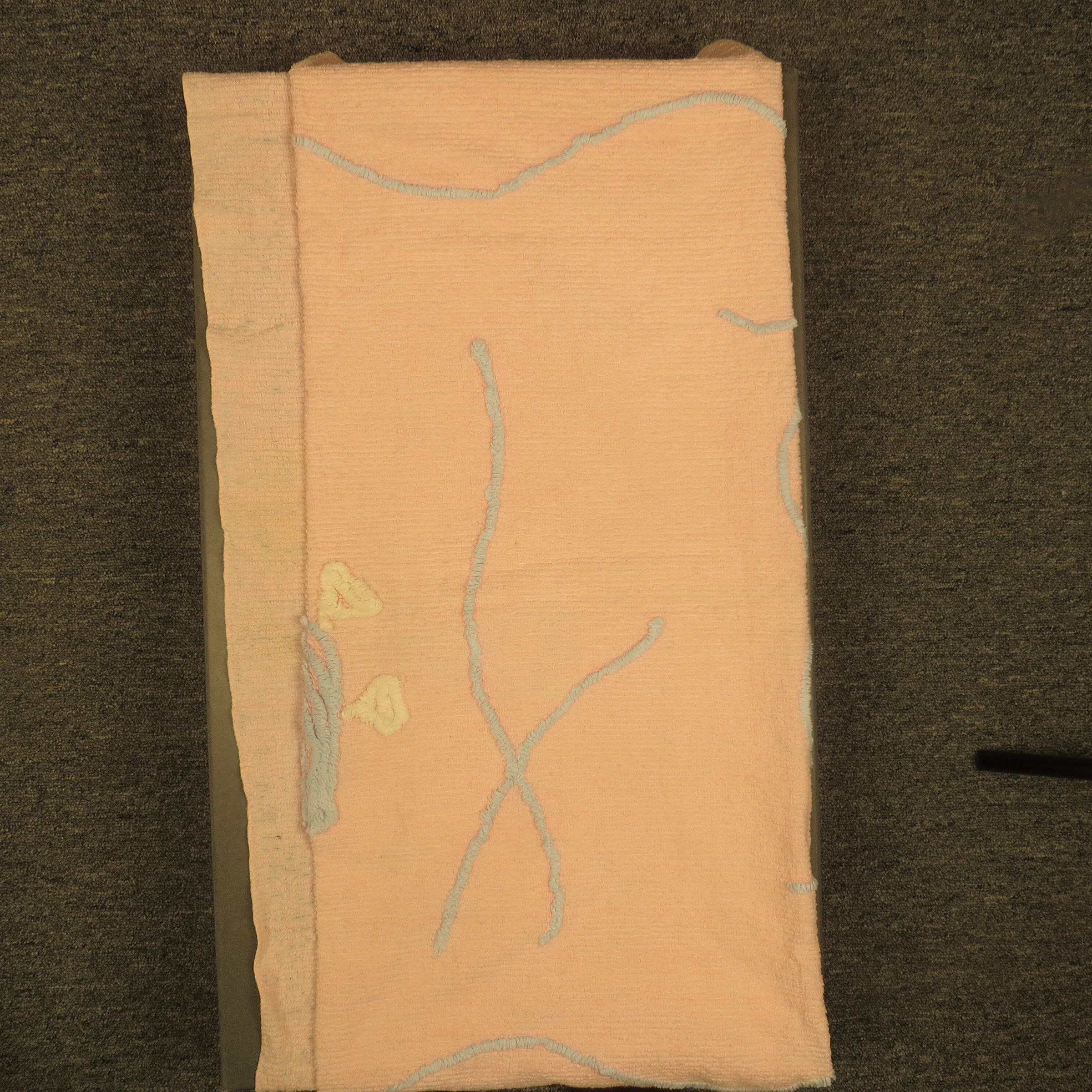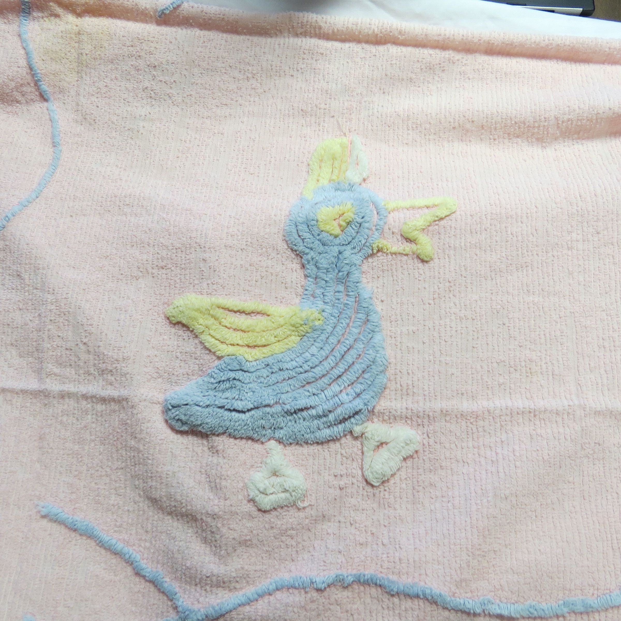 Pink cotton chenille bedspread or blanket. There is a central figure of a large applied duck of blue and yellow. Surround the central design is are blue swirly lines. The bedspread measures 41" (w) x 60" (l).