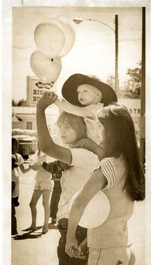 "Going Down" - Young child holding balloons - on the back of one person - woman in foregound holding ball under her arm