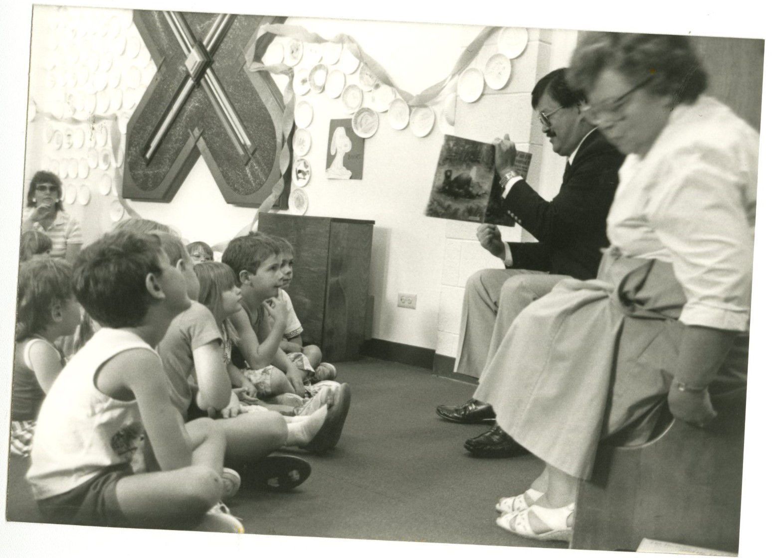 Item is a black-and-white photograph taken sometime before 1994, most likely during the late 1980s or early 1990s. The photo centers around Charles Ozaki and Mary Jane Bailey, who are sitting on stools at the front of a cinderblock room with paper plate decorations on the walls and a wooden door. The two are reading to a group of attentive children who are sitting on the floor in front of them, with Ozaki holding the book open so that the kids can see the pictures. They are in the 12 Garden Center building, which used to host the Broomfield Library and is now home to the Broomfield Veterans Museum. Mary Jane Bailey was Broomfield's first paid Library Director, hired in October 1961 after the city approved a grant. The library has since moved four times. Charles Ozaki spent eight years as the City and County Manager of Broomfield, then 29 years as Assistant (and later Deputy) City and County Manager.Photograph Details