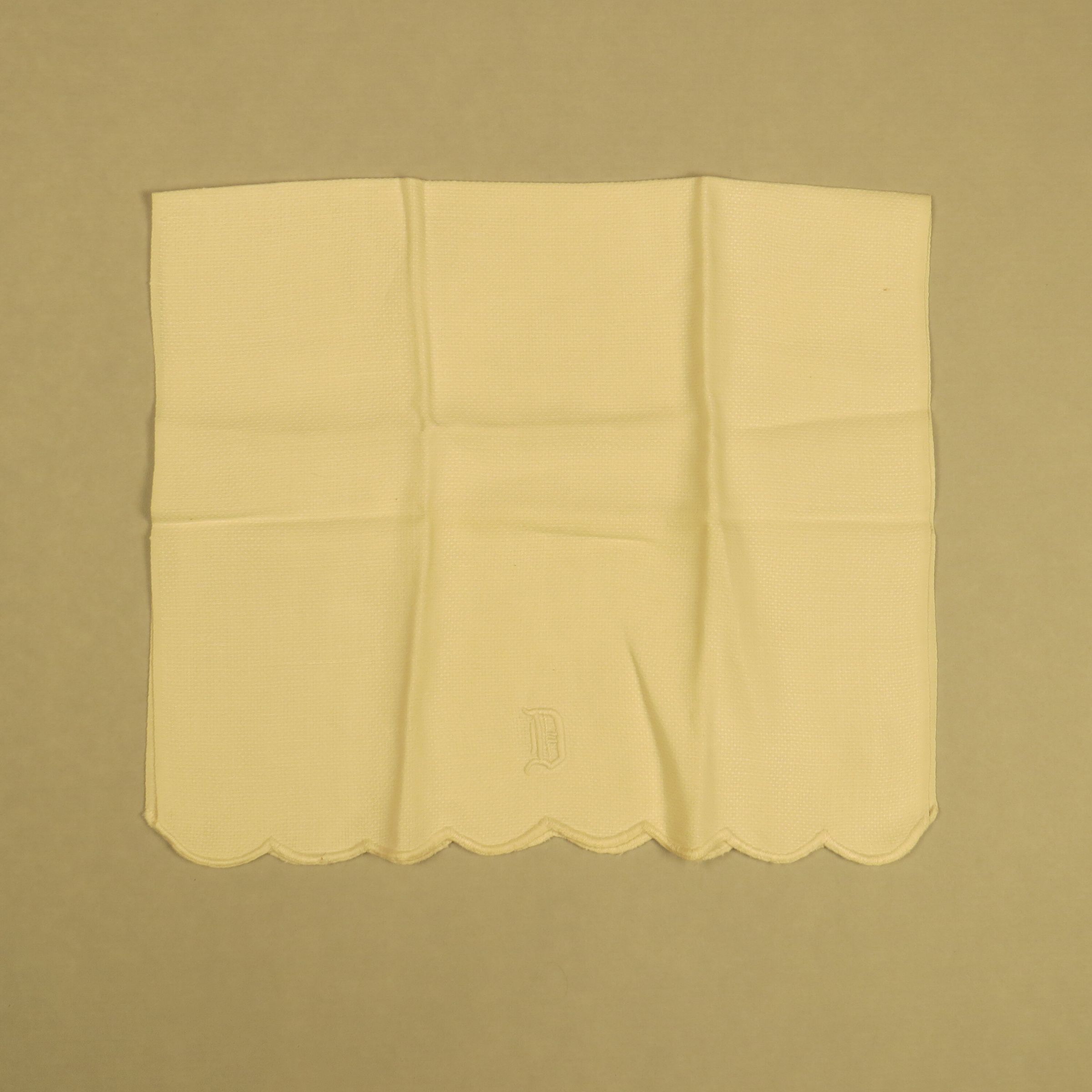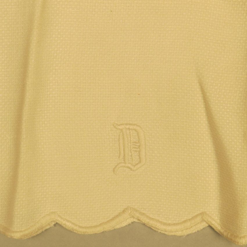 This is a white textured weave tea towel with scalloped edge and 3-D raised embroidered "D" at the bottom of one of the short ends. The scalloped edge has been tightly blanket-stitched to keep the edge from raveling or stretching. The towel measures 14.5" (w) x 24" (l).