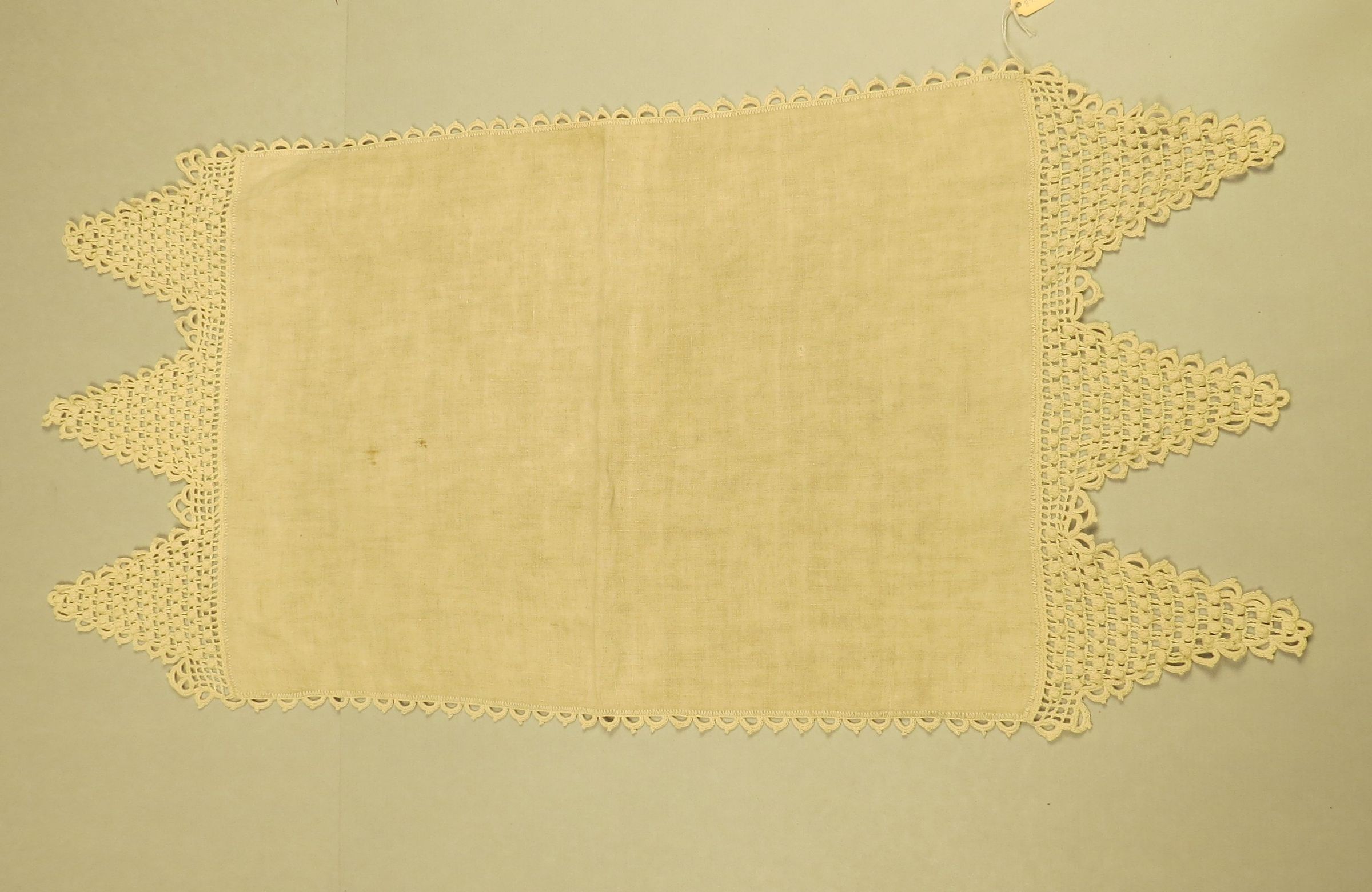 Rectangular linen with crocheted edge on both short sides that is scalloped with three triangles on either side. Small crocheted scalloped trim on long ends. The furniture scarf measures 18" (w) x 35" (l).