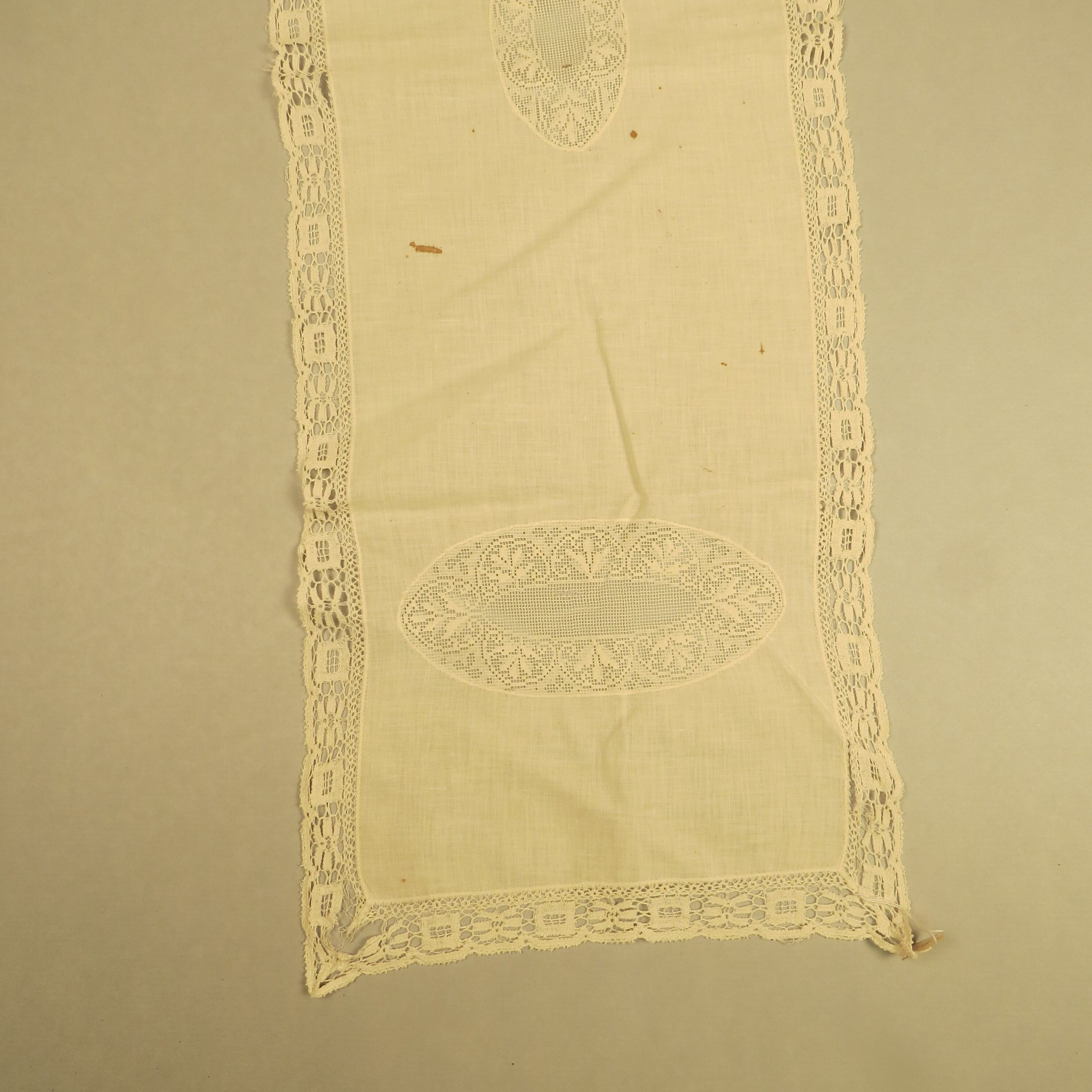 Long rectangular piece of cotton with lace oval insets at intervals and facing in different directions. There is a matching weight lace around the outside of the entire scarf. Scarf measures 14" (w) x 44" (l).