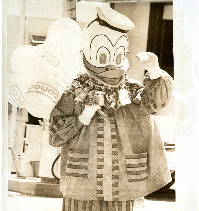 Adult in Donald Duck Costume, Holding Conoco balloons
