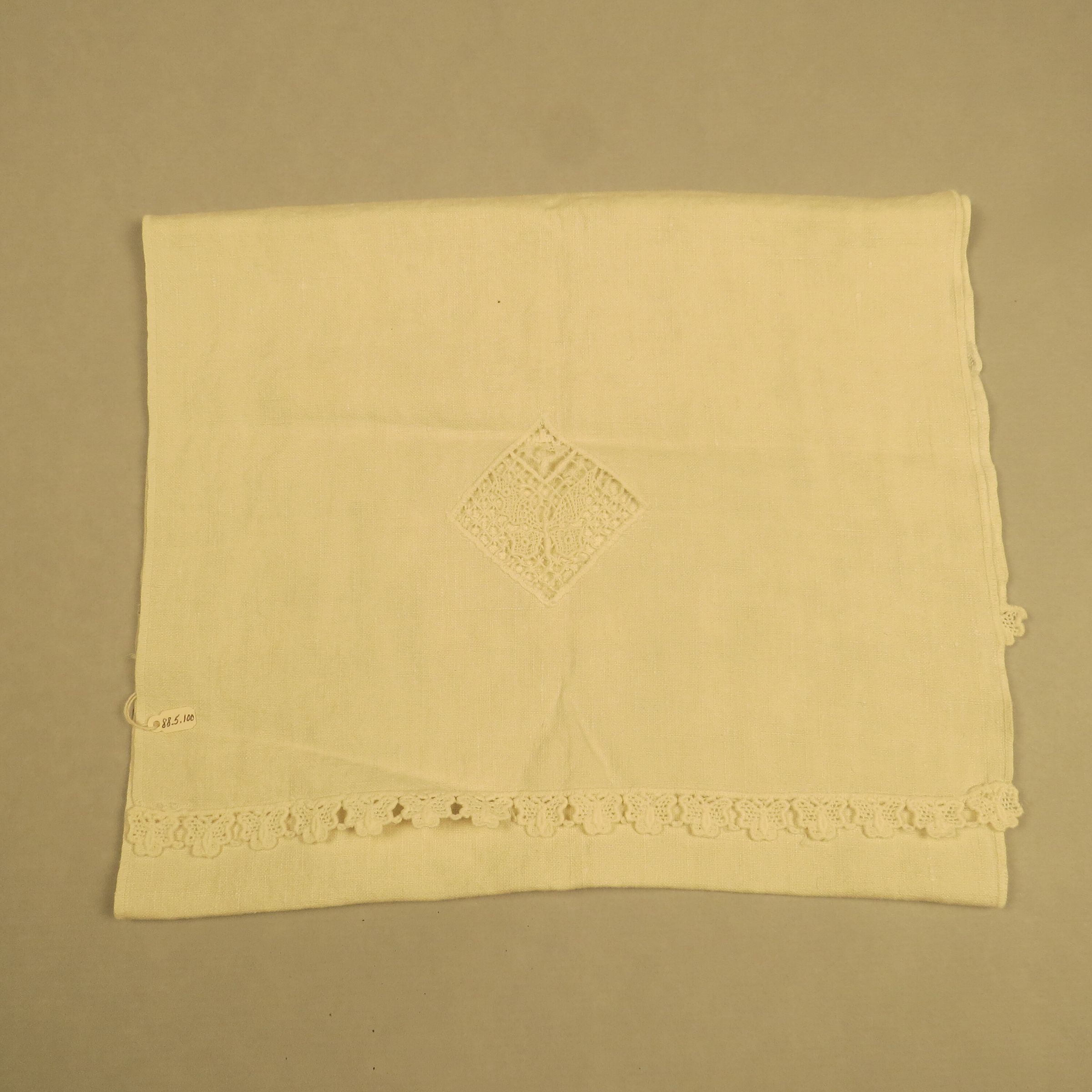 Off-white length of cotton with a slub weave. Rectangular and long in shape. There is a square on point at one of the short ends that has been embroidered and inset into both of the short ends. There is a thicker yarn crochet trim on the short ends as well. The furniture scarf measures 16" (w) x 48" (l).Collection