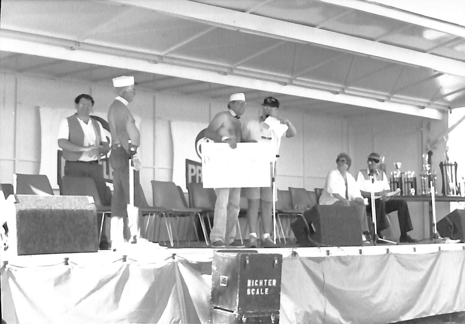 Item is a black-and-white photograph taken during the 1989 Broomfield Days celebration. In the photo, four men stand on a stage lined with chairs, which sits beneath the awning of a building with Pringles posters on its walls. Two of the men are shirtless, wearing hats and collars, and one of them is holding a sign that reads "Bal Swan Duz Donuts Topless." The man towards the center is possibly Biel Sish. Next to the men is a table housing trophies of various sizes, and behind this table sits another man and woman. A box sitting in front of the stage reads "Richter Scale." This photo was most likely taken during some sort of awards ceremony.Photograph Details
