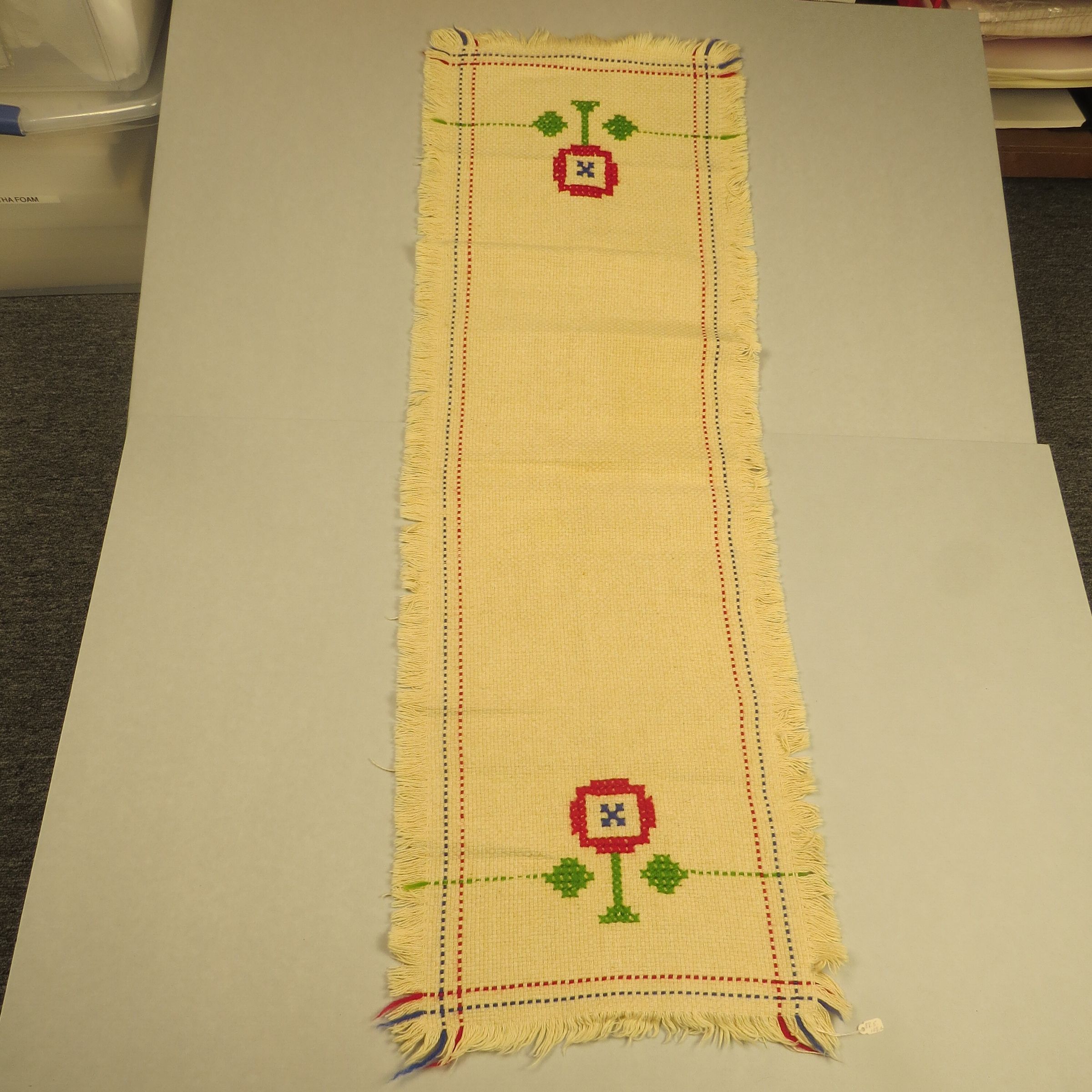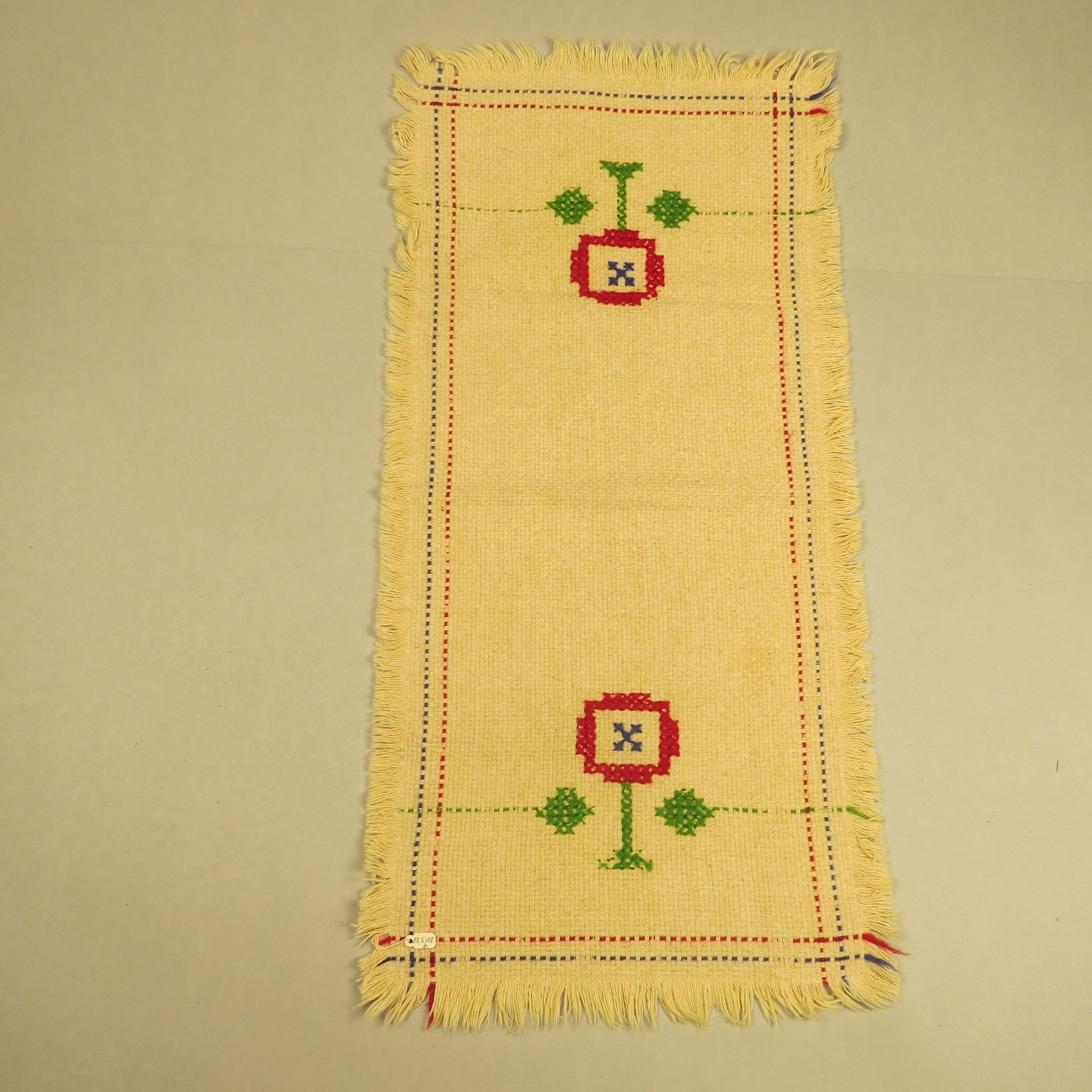 Loosely woven tan material with loose fringe on all sides. There is a tapestry stripe woven in both length and width of blues and reds. On both short ends there is a little pixelated embroidery of a flower, stem and leaves. The furniture scarf measures 16" (w) x 44" (l).Collection
