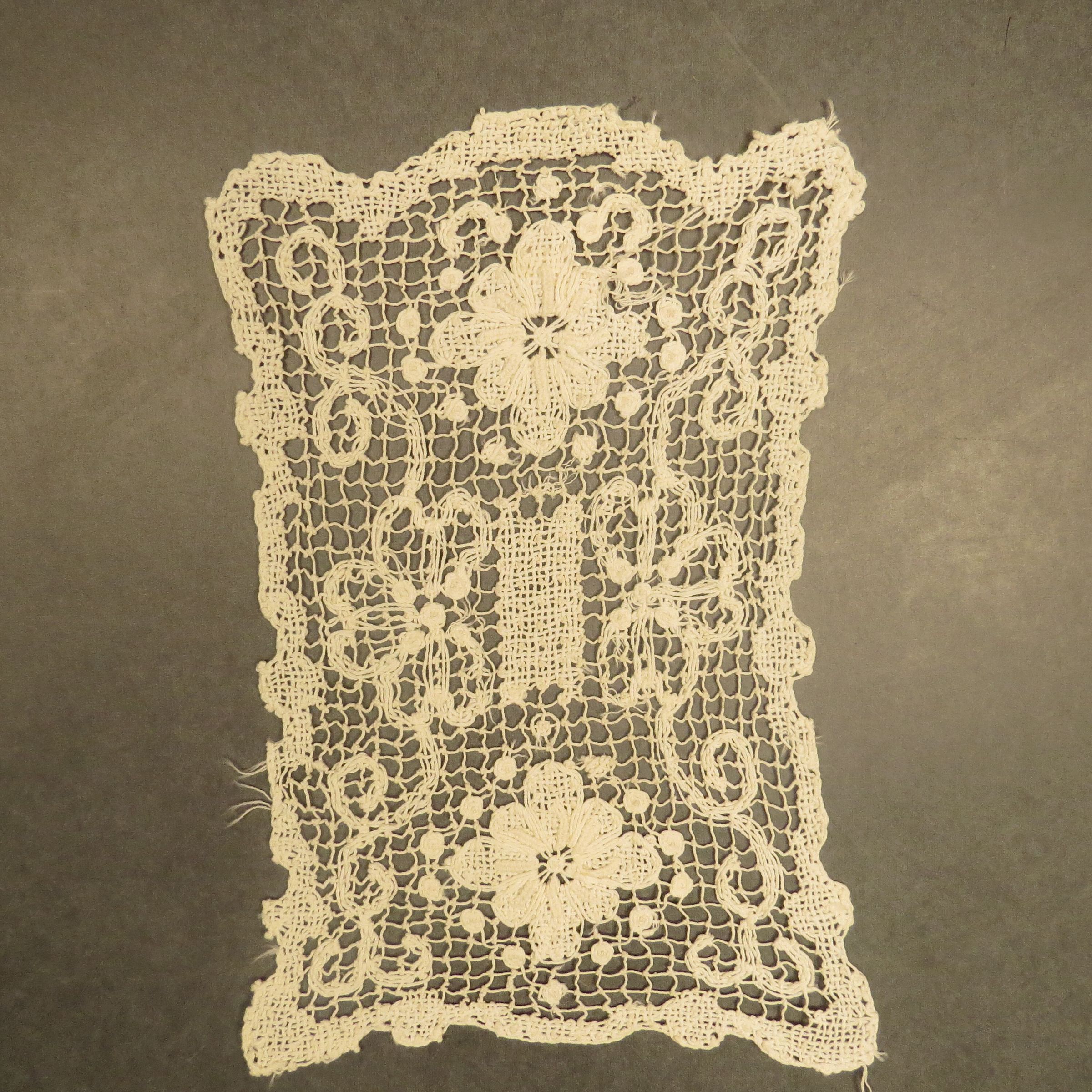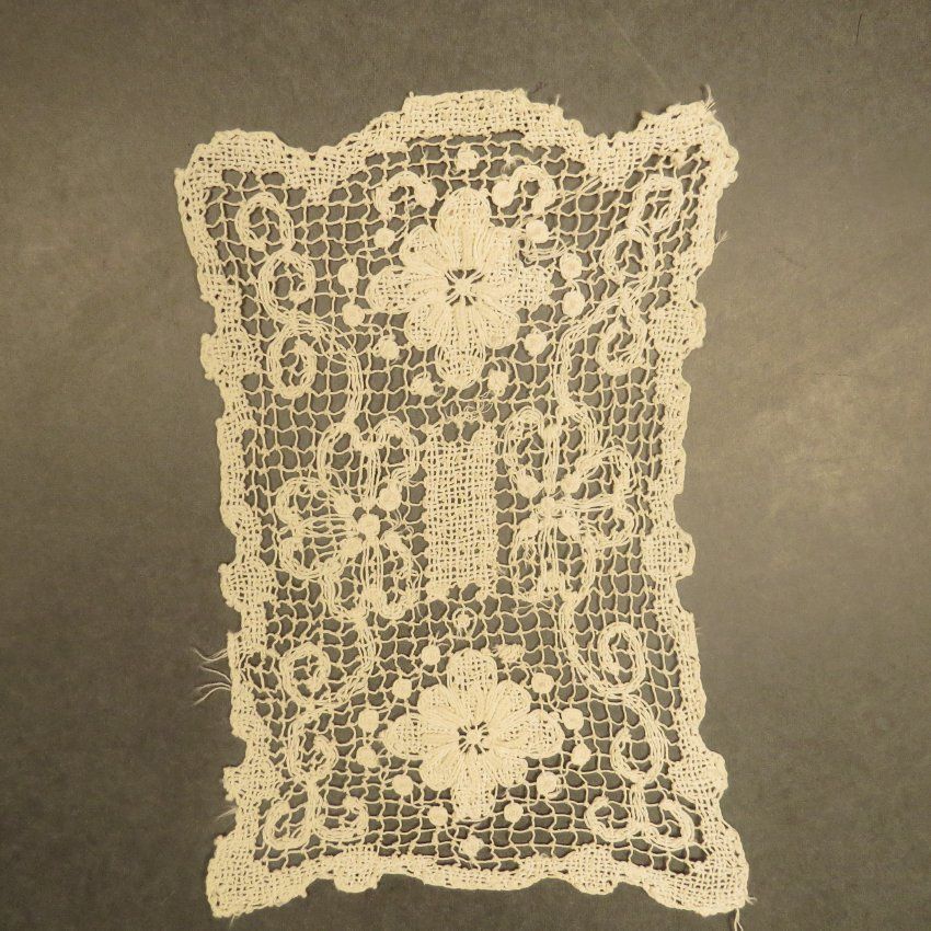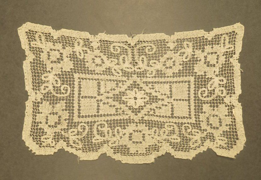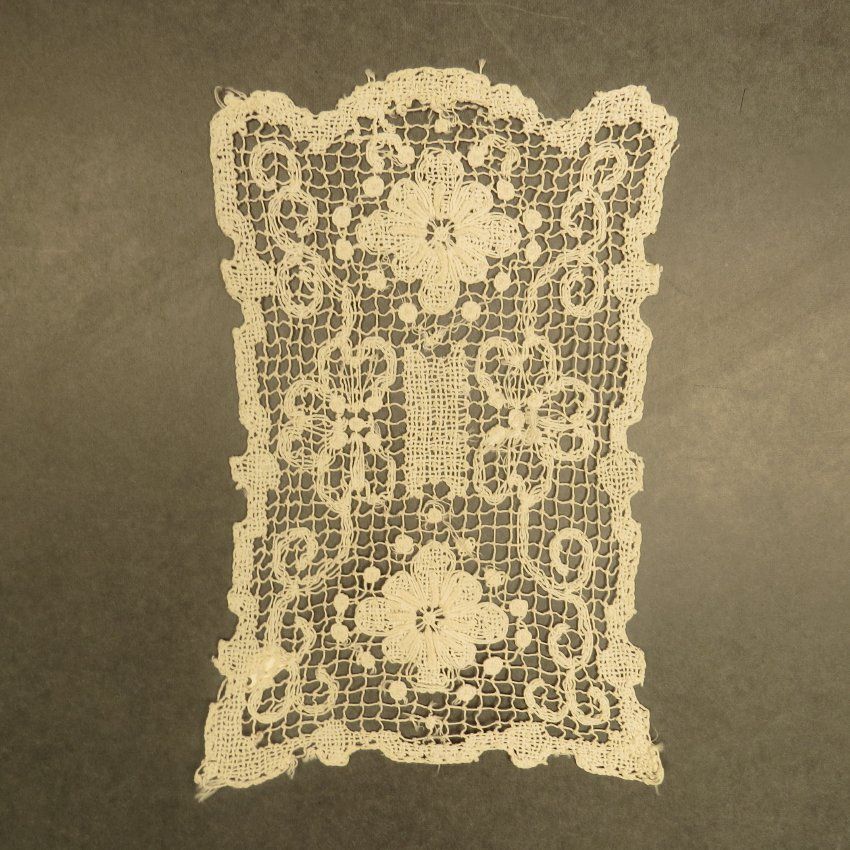 A set of three textiles used to protect a chair most likely. The larger piece is used for the back of the chair and the matching smaller pieces are for the arms of the chair. Rectangular dresser scarf. From 3 piece set (a-c). Furniture scarf 6" (w) x 10" (l).Collection