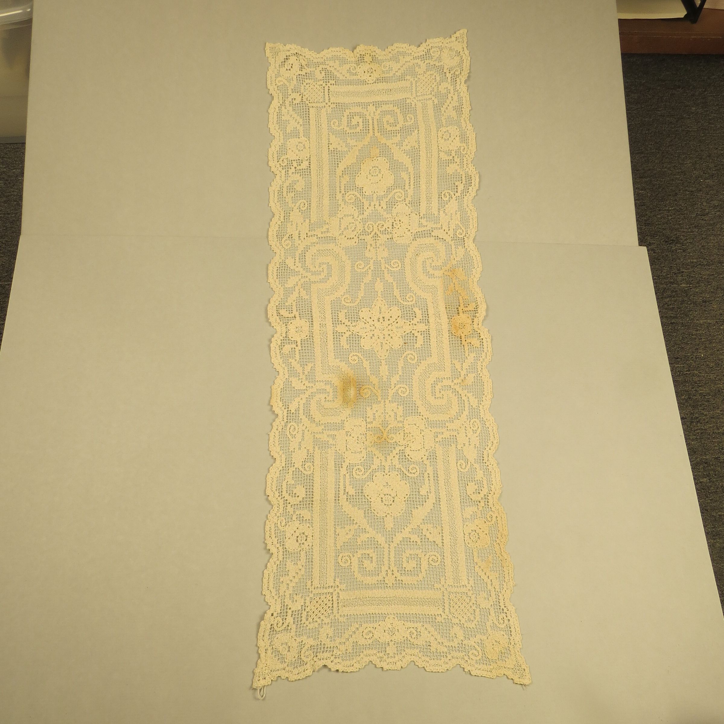 Long and narrow rectangular white lace bureau scarf. The bureau scarf measures 13.5" (w) x 41" (l).
