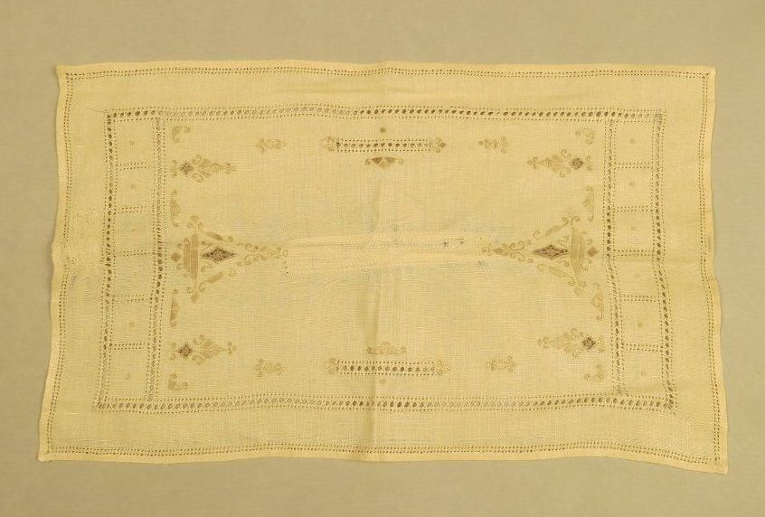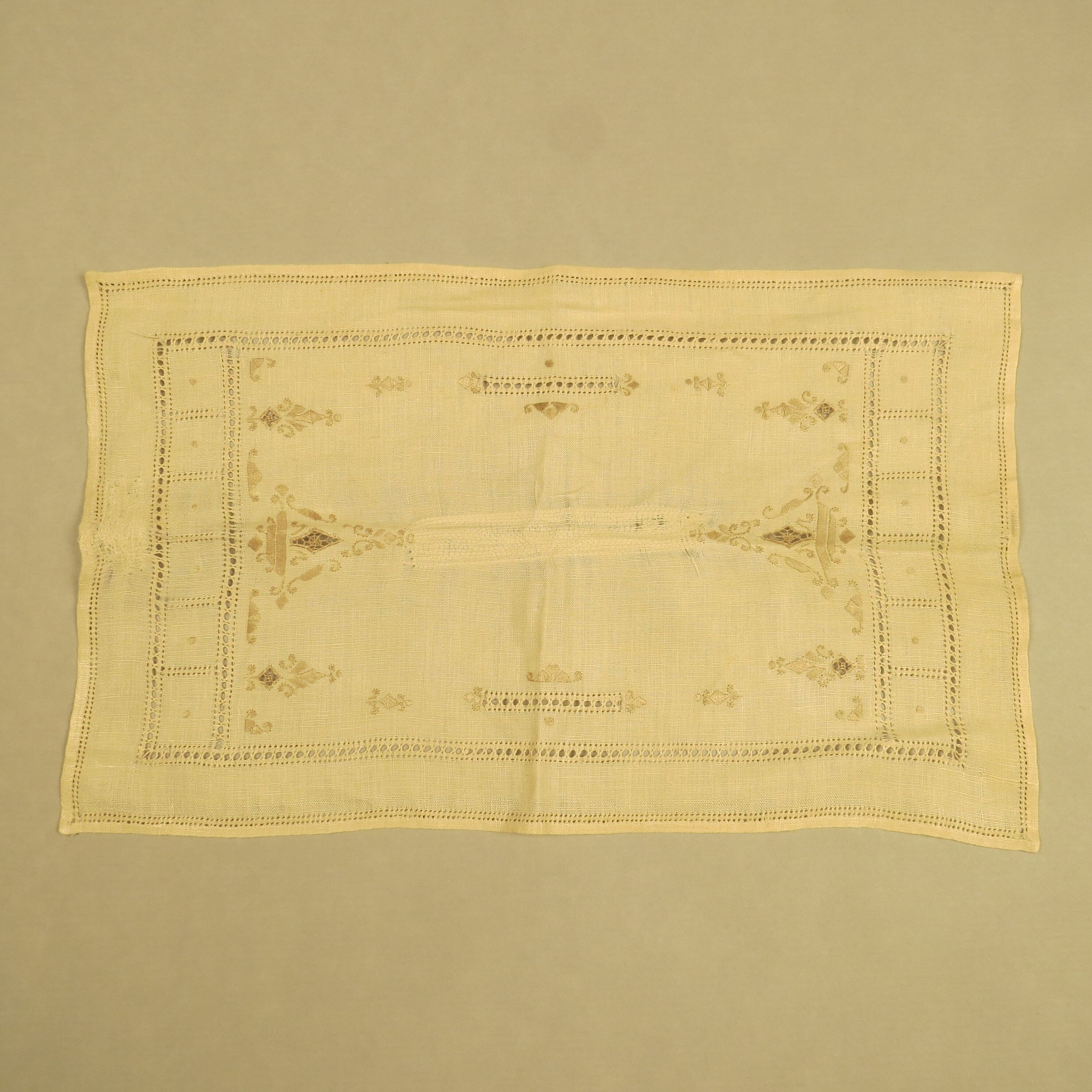 Small rectangular scarf with openwork around edge and in concentric rectangles. There is also gray-brown embroidery that may have been a different color at one time. At center is a tear or rip that has been heavily topstitched to repair. The furniture scarf measures 10" (w) x 17" (l).