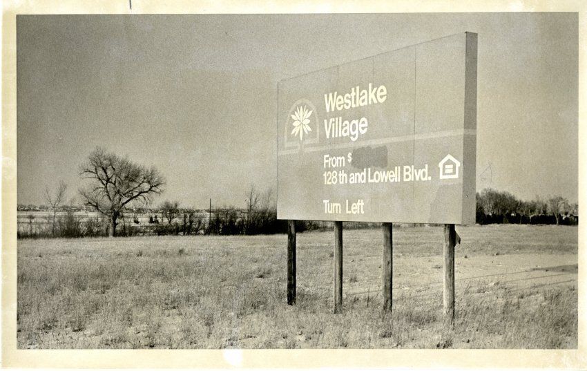 Sign for Westlake Village - on empty land From $ -- covered 128th and Lowell Blvd. Turn Left